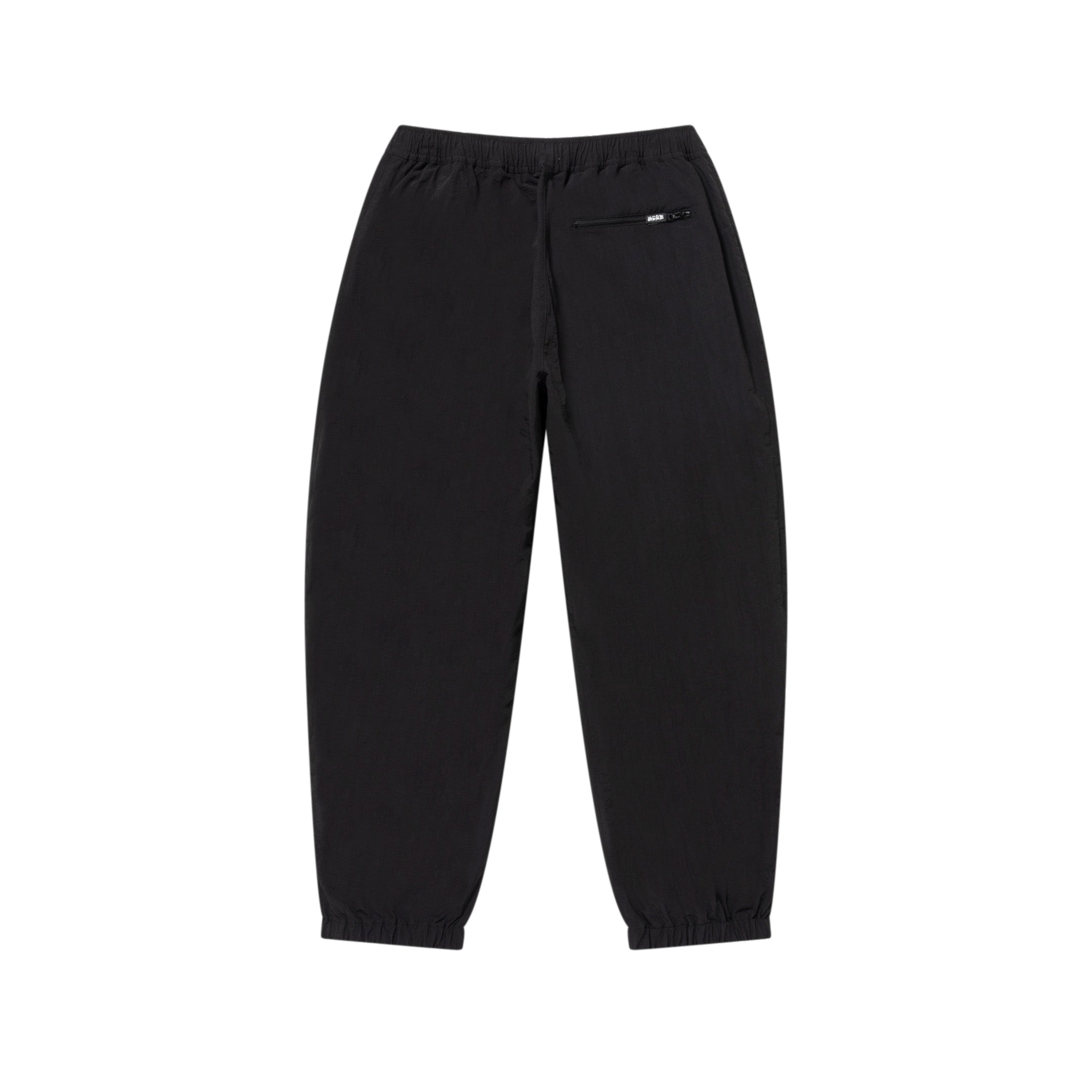 Track pants featuring a “Handle With Care” label logo small patch in the same color as the body on the left thigh. It is made of water-repellent nylon fabric. Available in a set-up with pants of the same design.