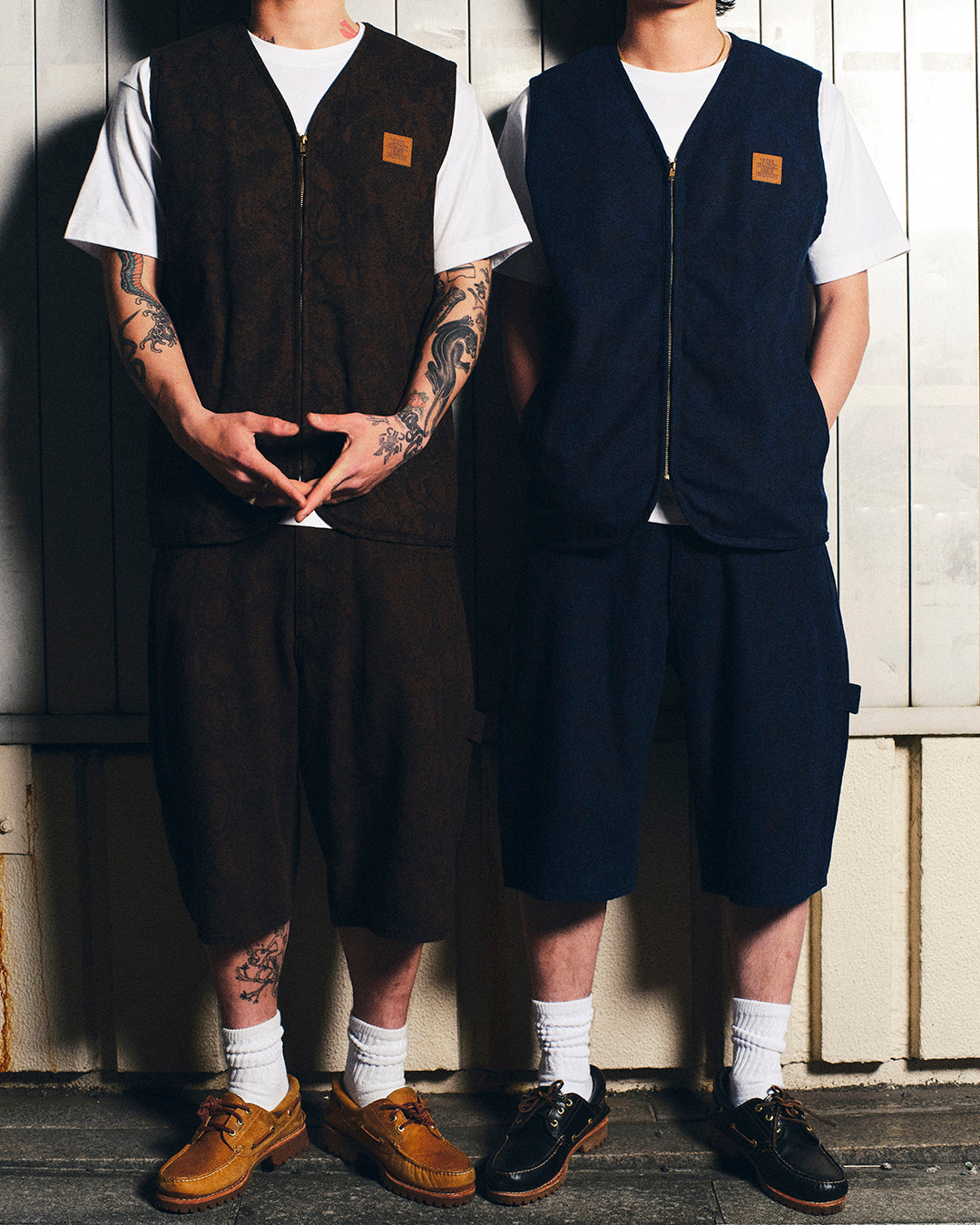 ブランドオリジナルのパイソン柄で構築されたダック生地のバギーパンツ。 同デザインのワークベストとセットアップで展開。 ボディは 11.7oz。