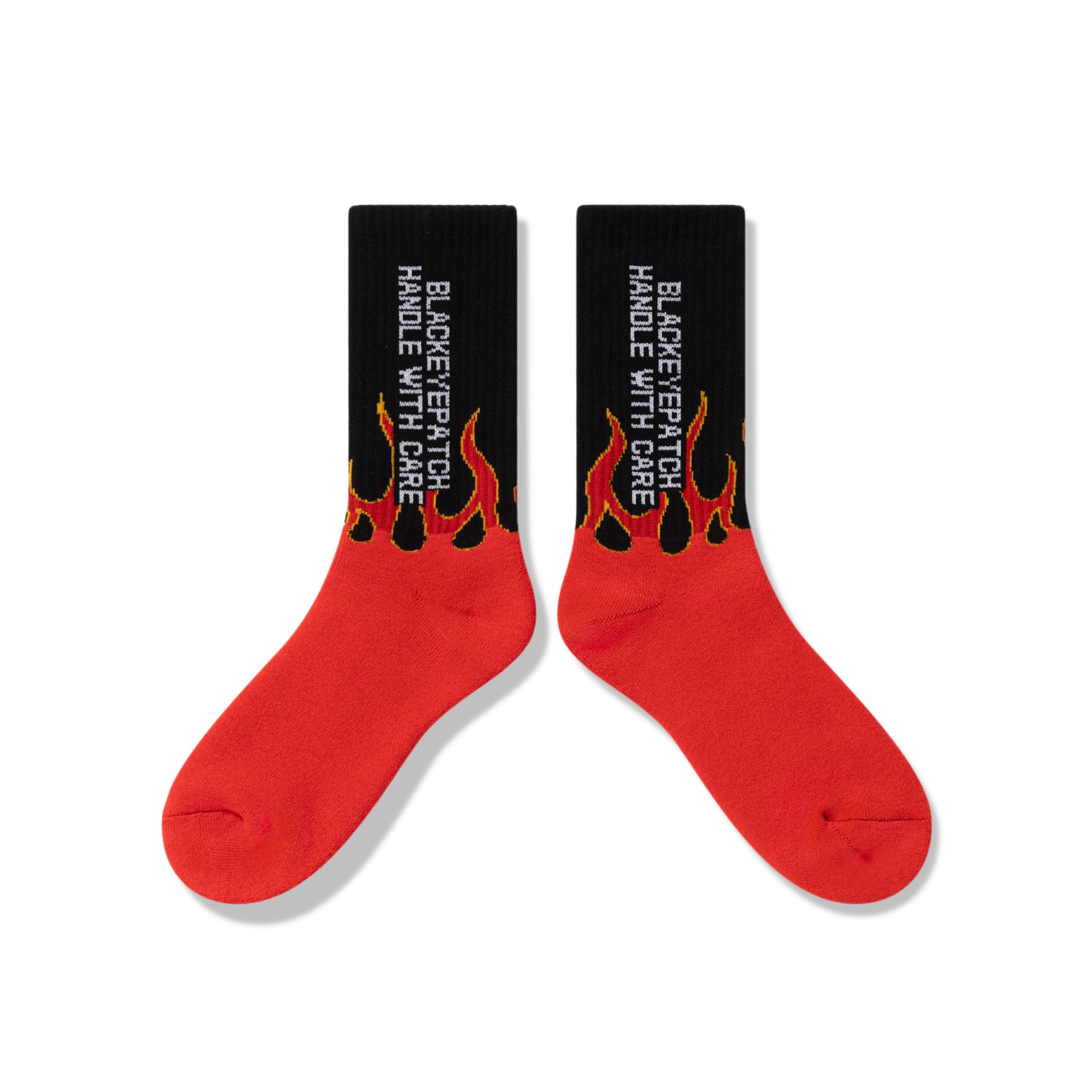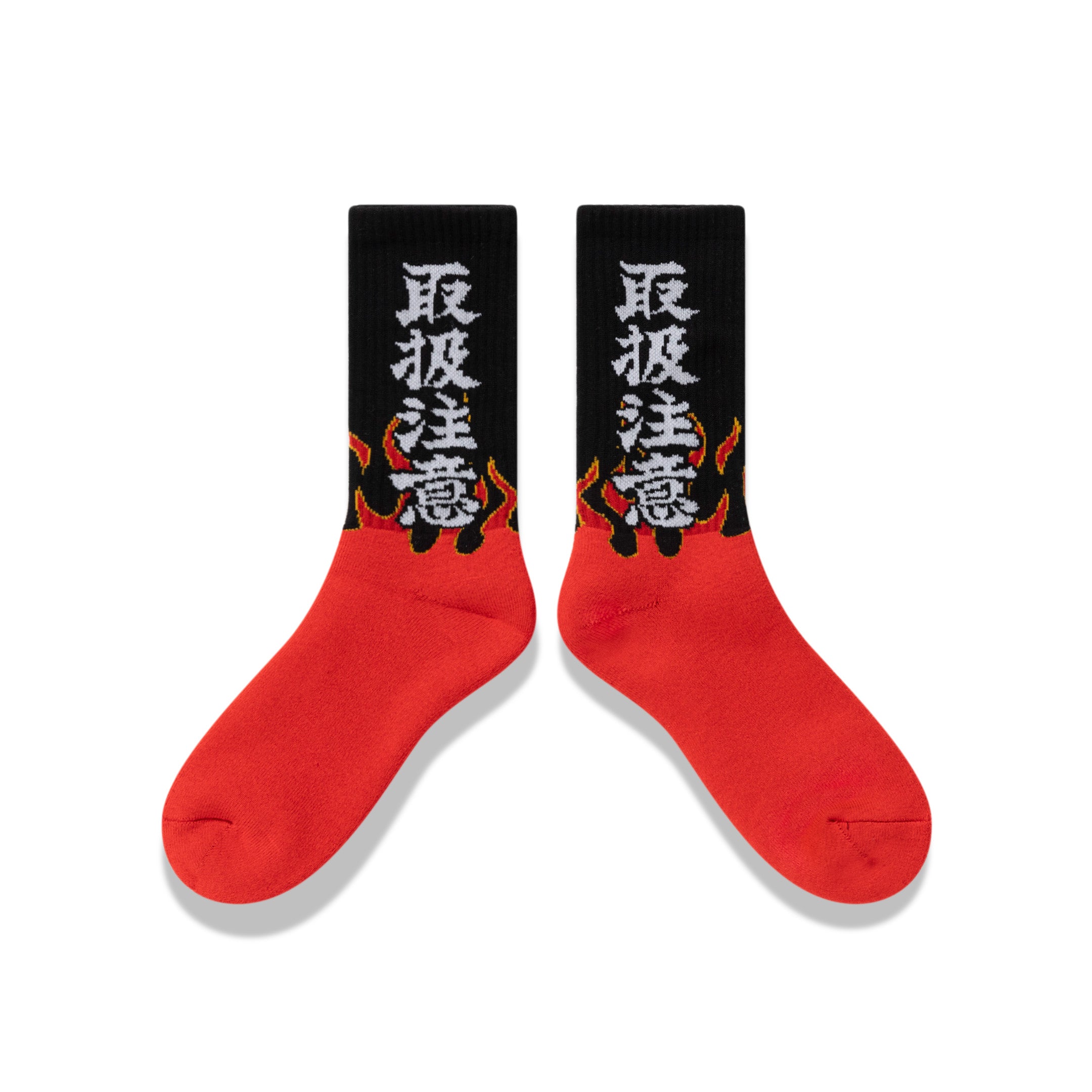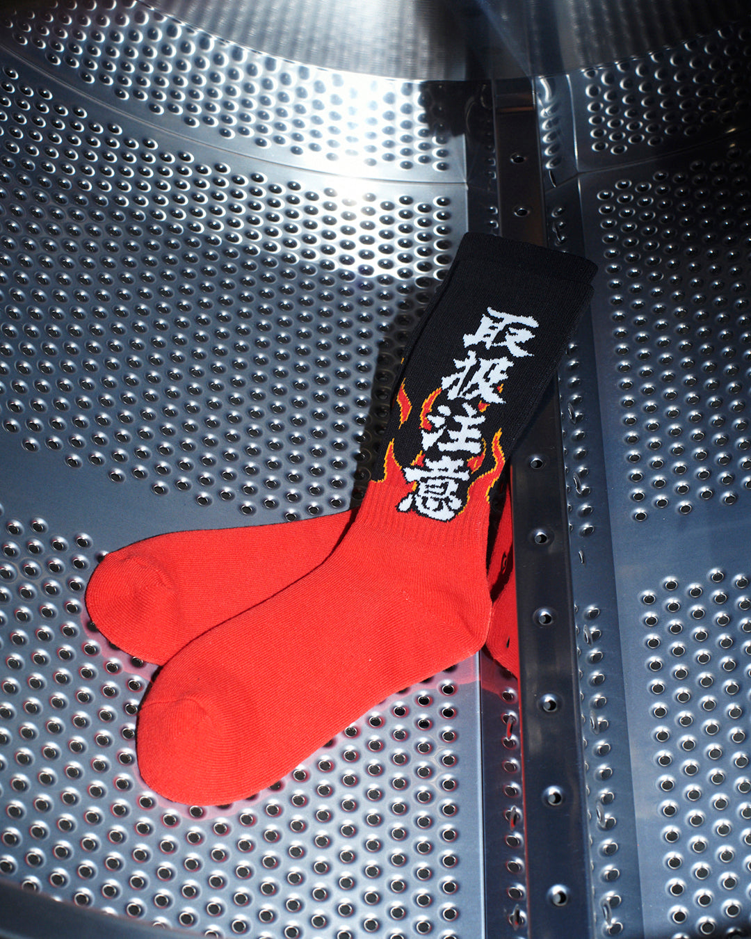"取扱注意" のロゴとファイヤーパターンを組み合わせたグラフィックを編み込んだリブ編みのソックス。