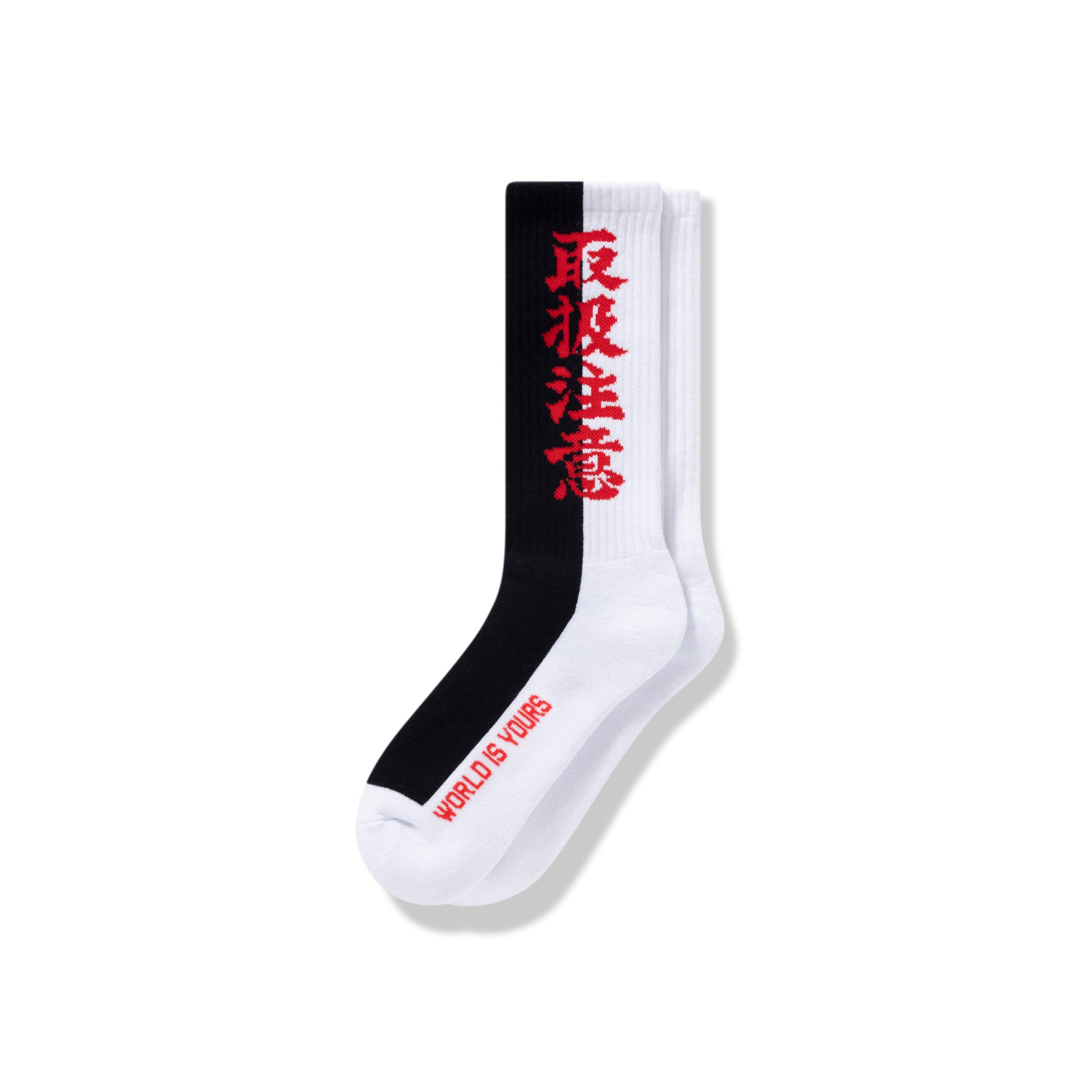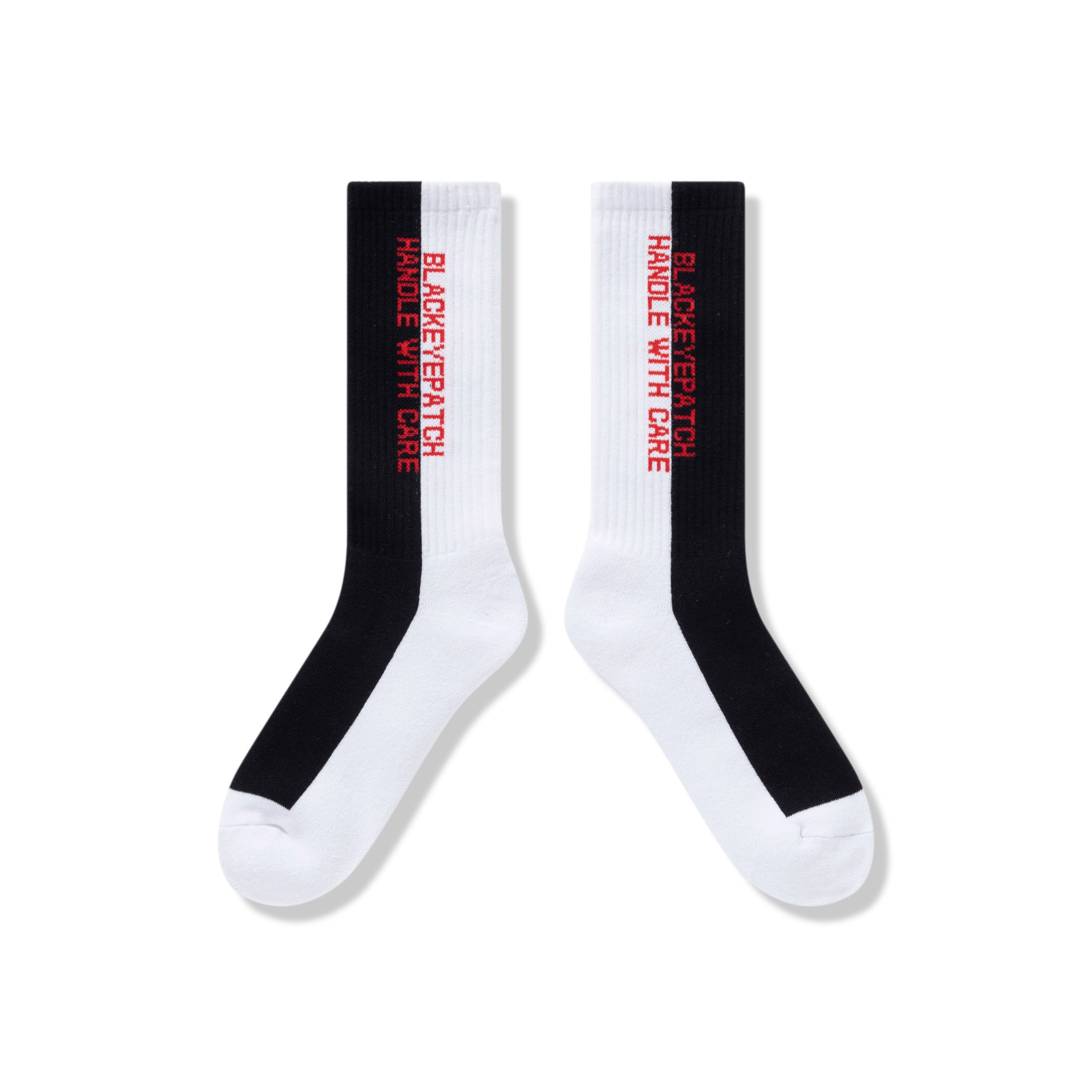 Standard ribbed socks in black and white bicolor with red “Handle With Care” logo woven into the fabric. The coloring is reminiscent of masterpiece gangster movies.