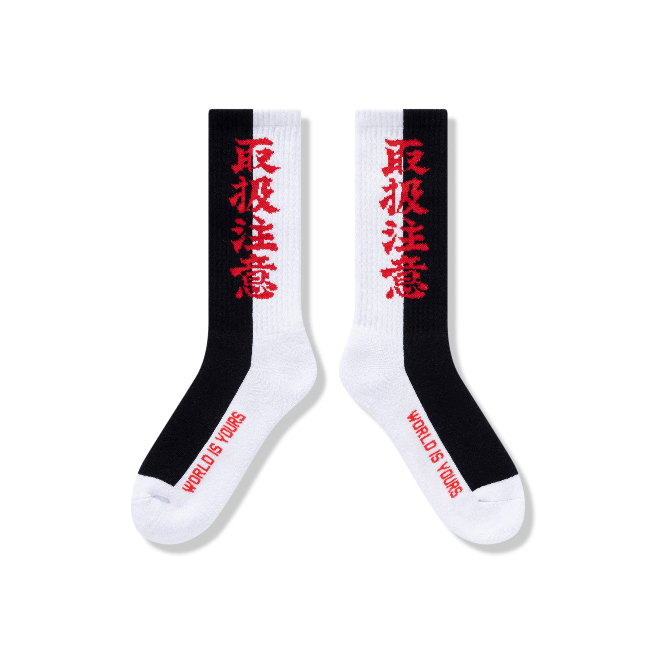 ブラックとホワイトのバイカラーにレッドの "取扱注意" ロゴを編み込んだ定番のリブ編みソックス。名作ギャング映画を彷彿させるカラーリング。