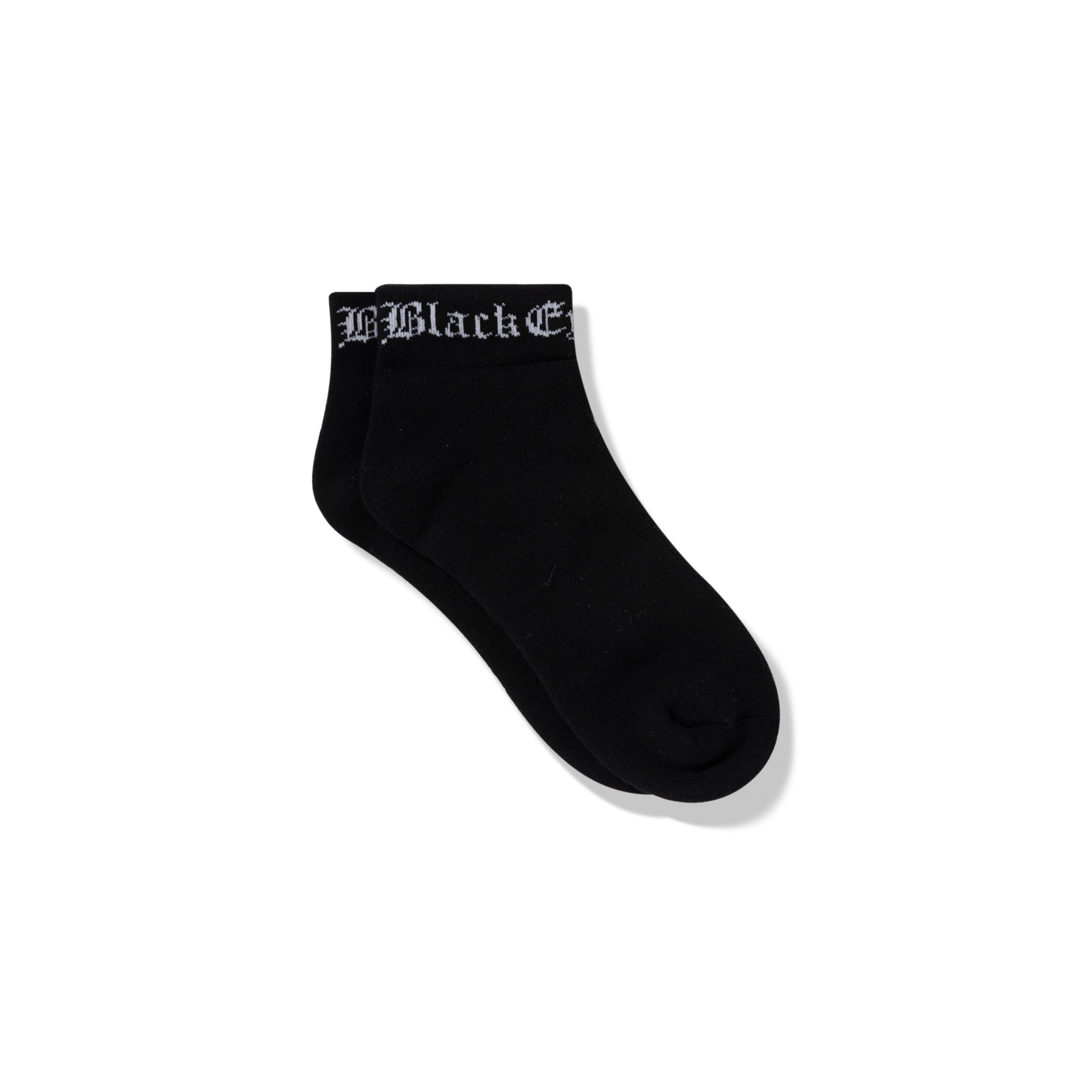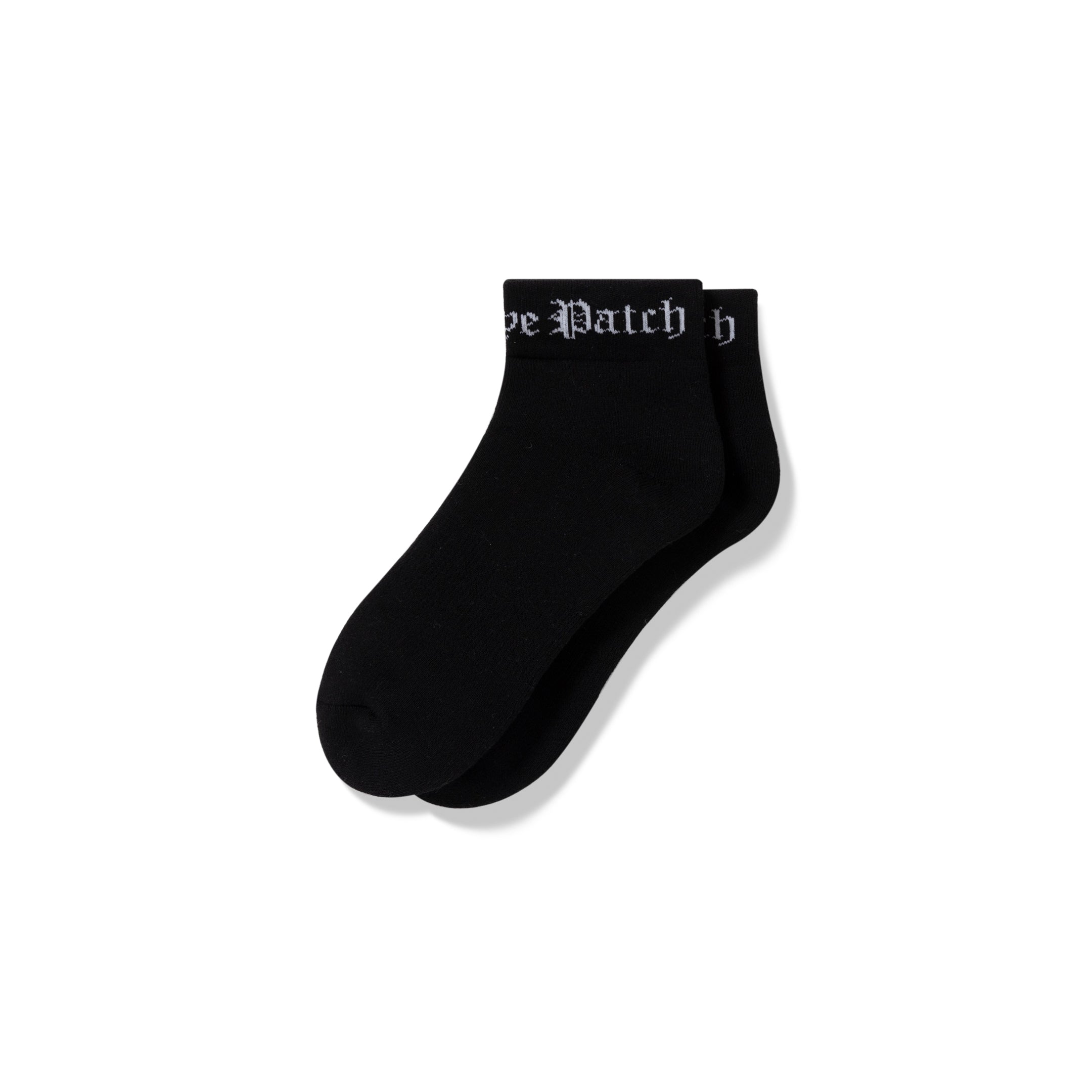 Old English のブランドネームが履き口に織り込まれたミドル丈のソックス。