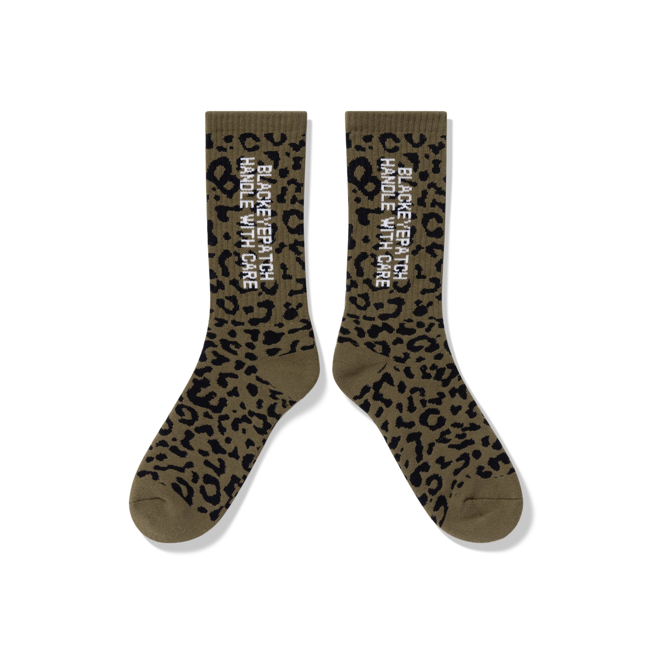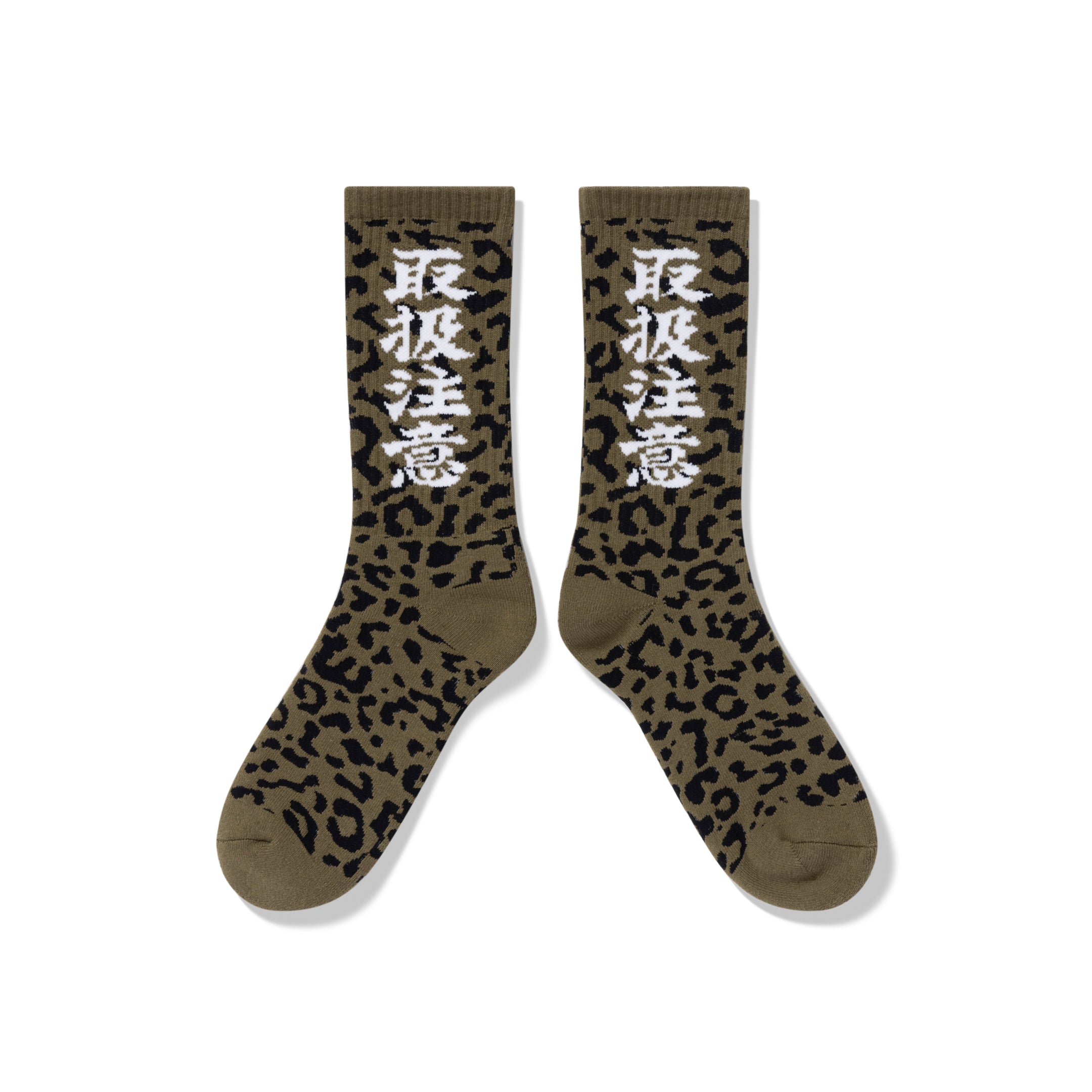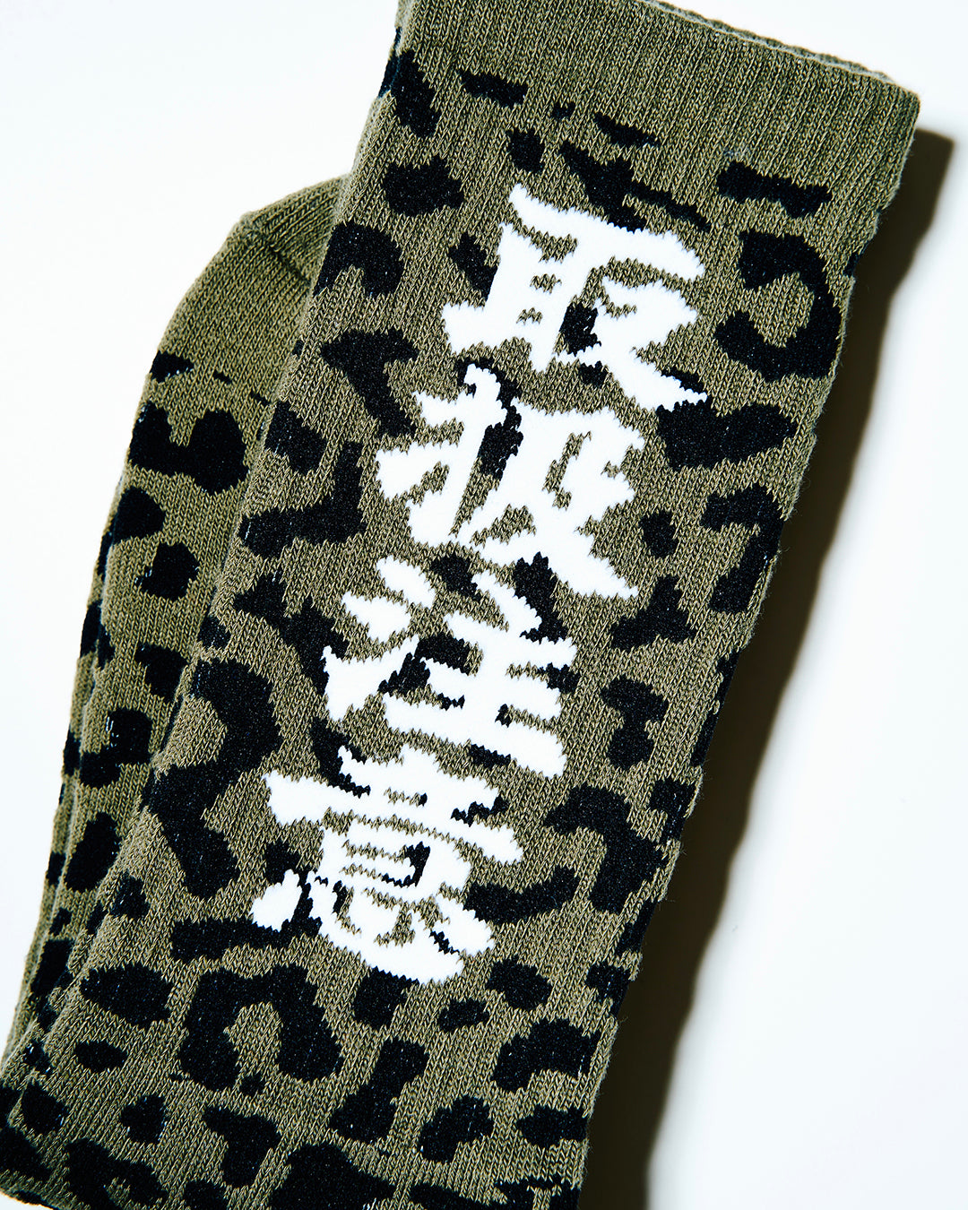 "取扱注意" のデザインを編み込んだリブ編みのソックス。反対側にはブランドネームと "HANDLE WITH CARE" のメッセージが織り込まれている。今回はオリジナルのレオパード柄を採用。