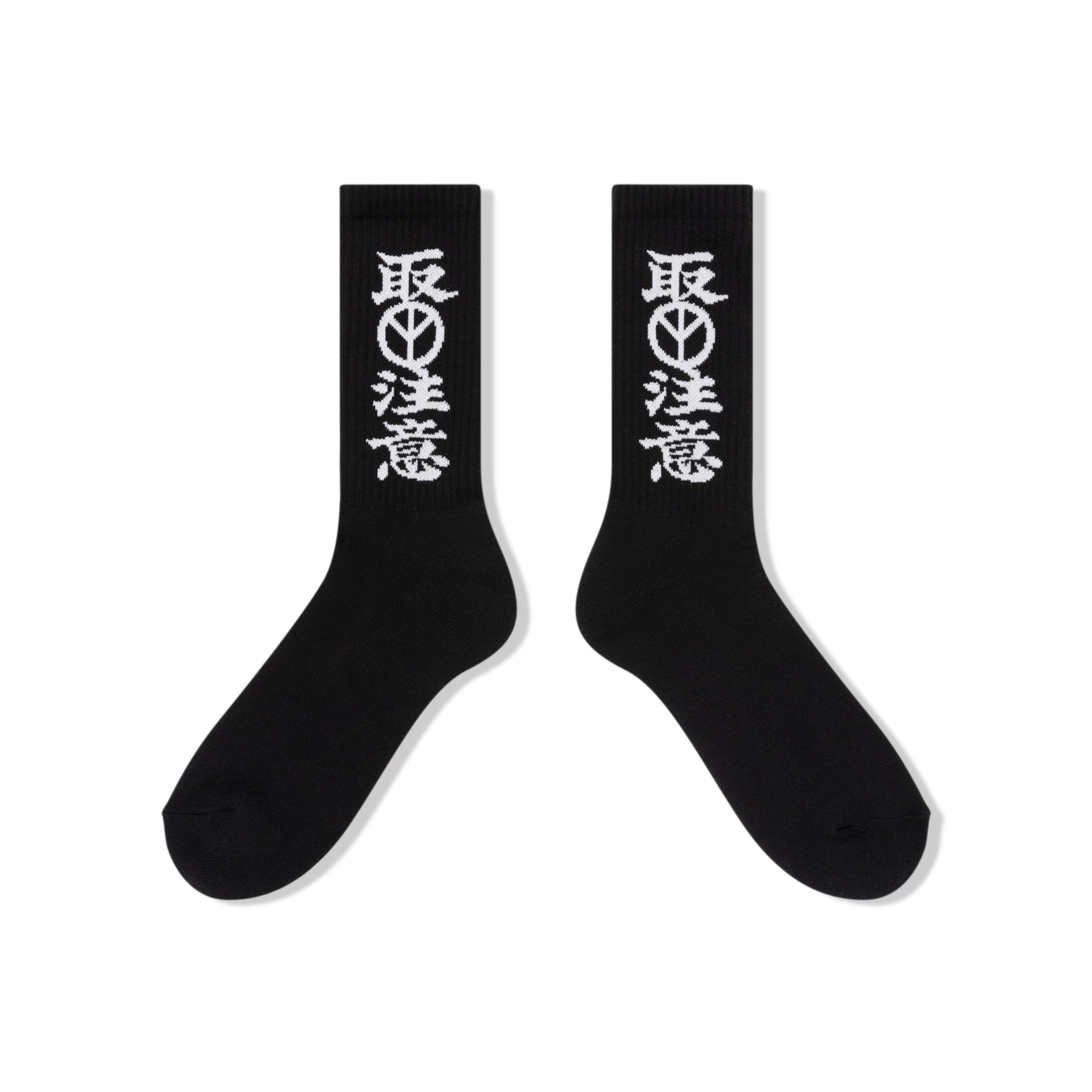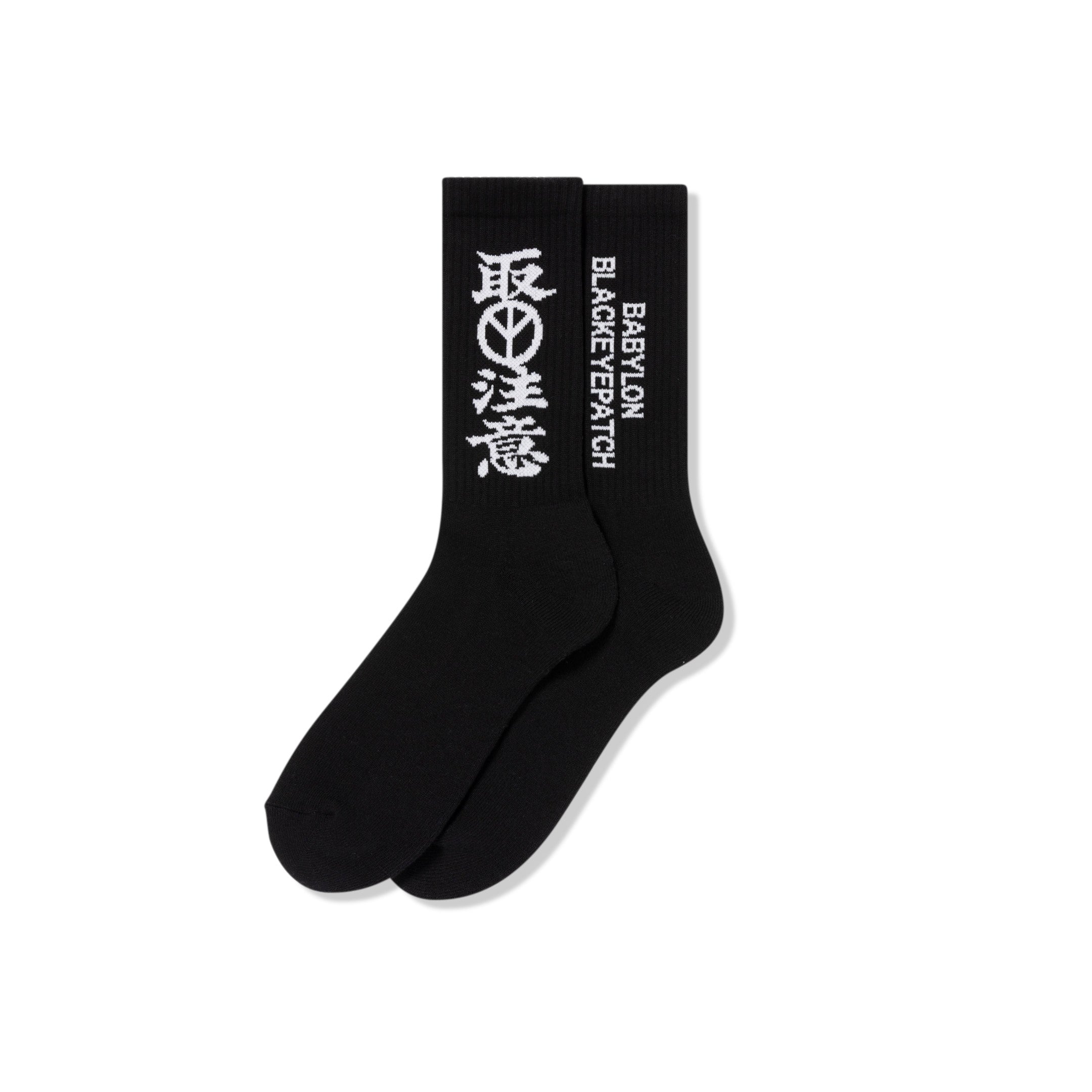 "取扱注意" ロゴに BABYLON LA の定番ロゴに使用のピースマークを組み合わせたデザインのソックス。