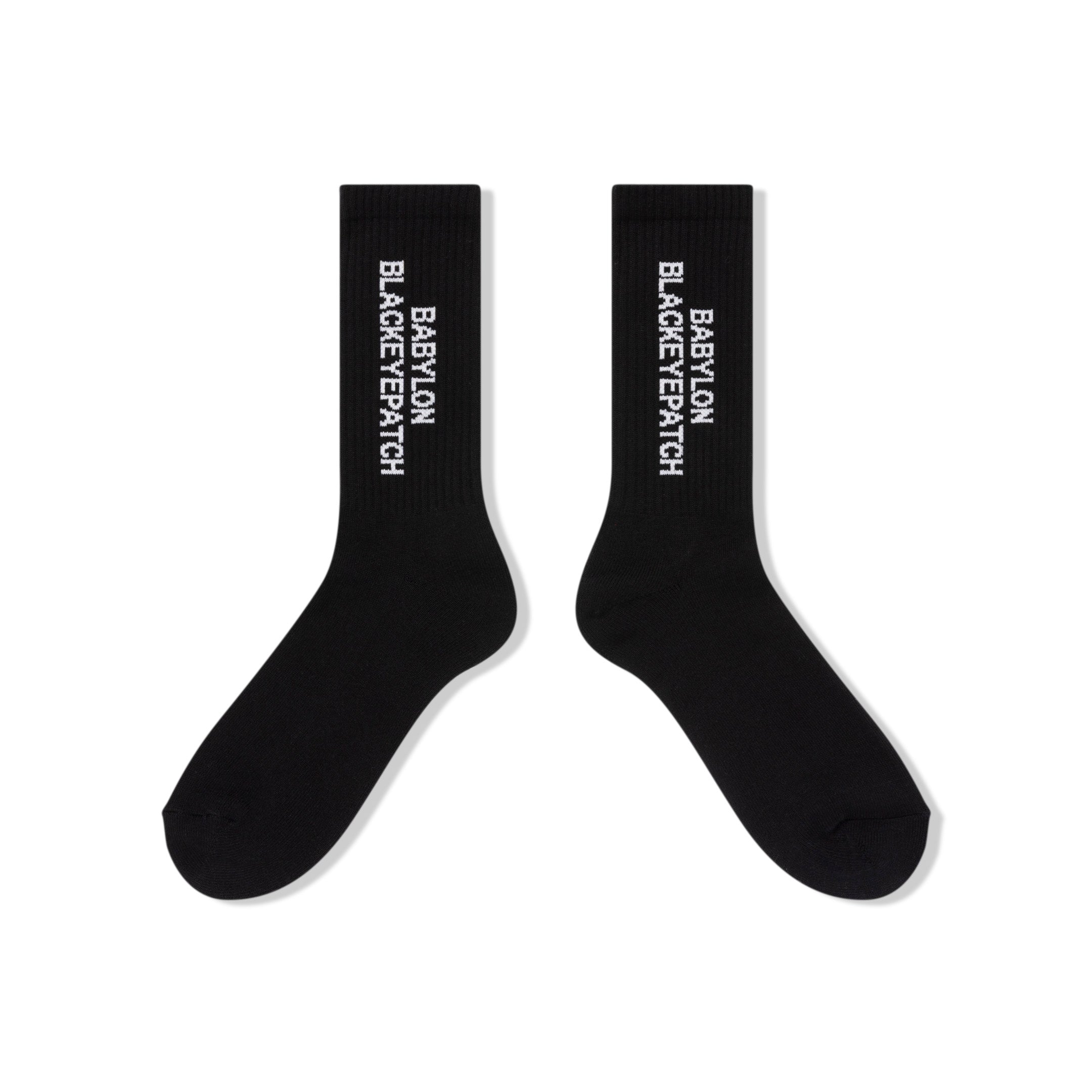 Collaboration with Los Angeles-based skate brand BABYLON LA. Socks featuring a woven design combining the "Handle with Care" logo with BABYLON LA's standard logo peace symbol.