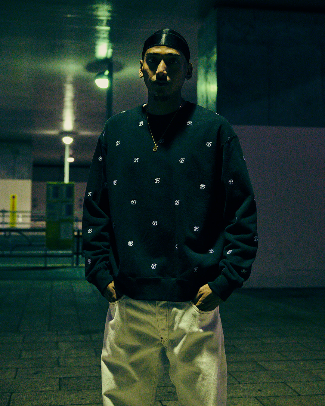 ボディ全面に "B EMBLEM" のロゴを小さく刺繍で施した総柄仕様に仕上げたクルーネックスウェット。