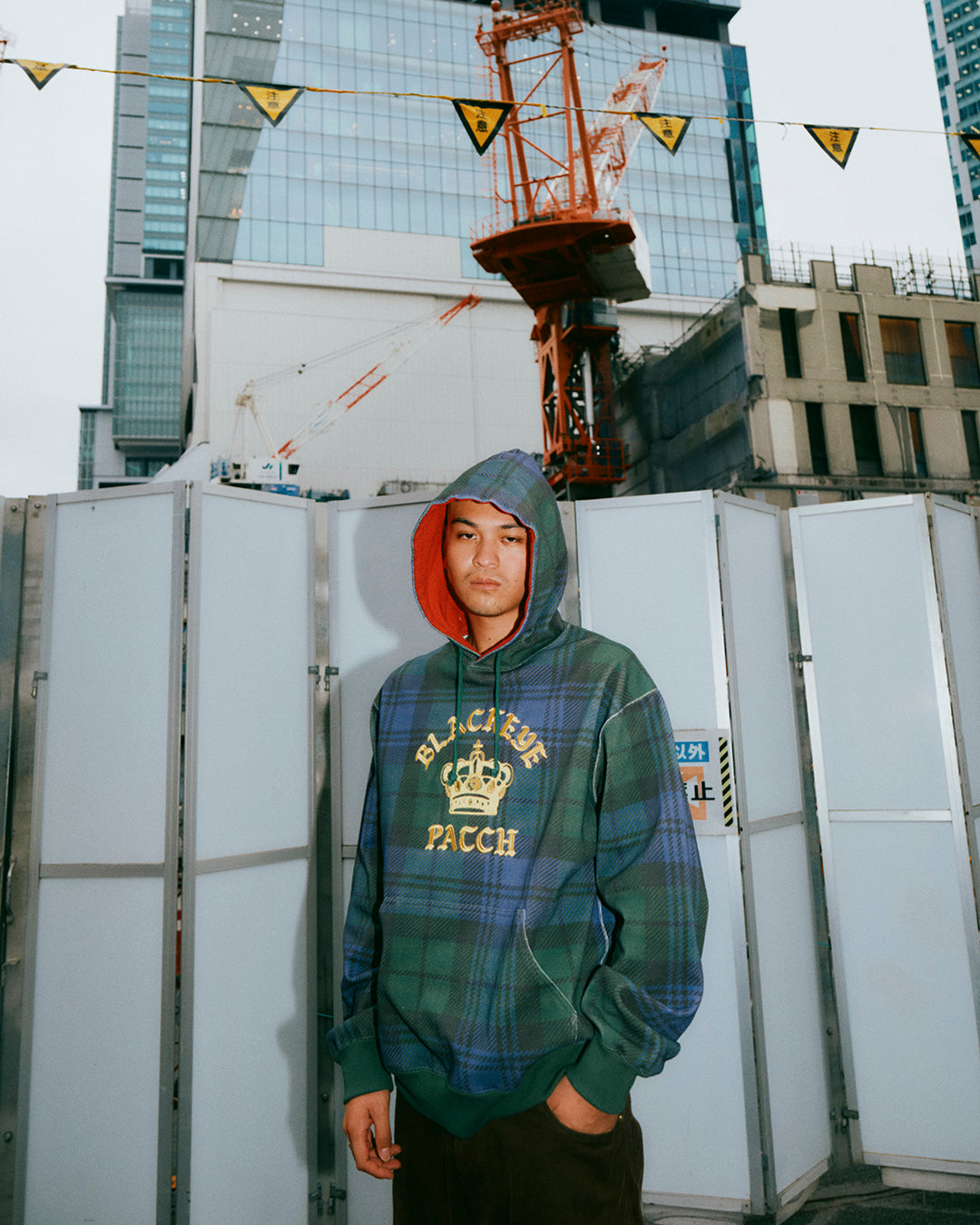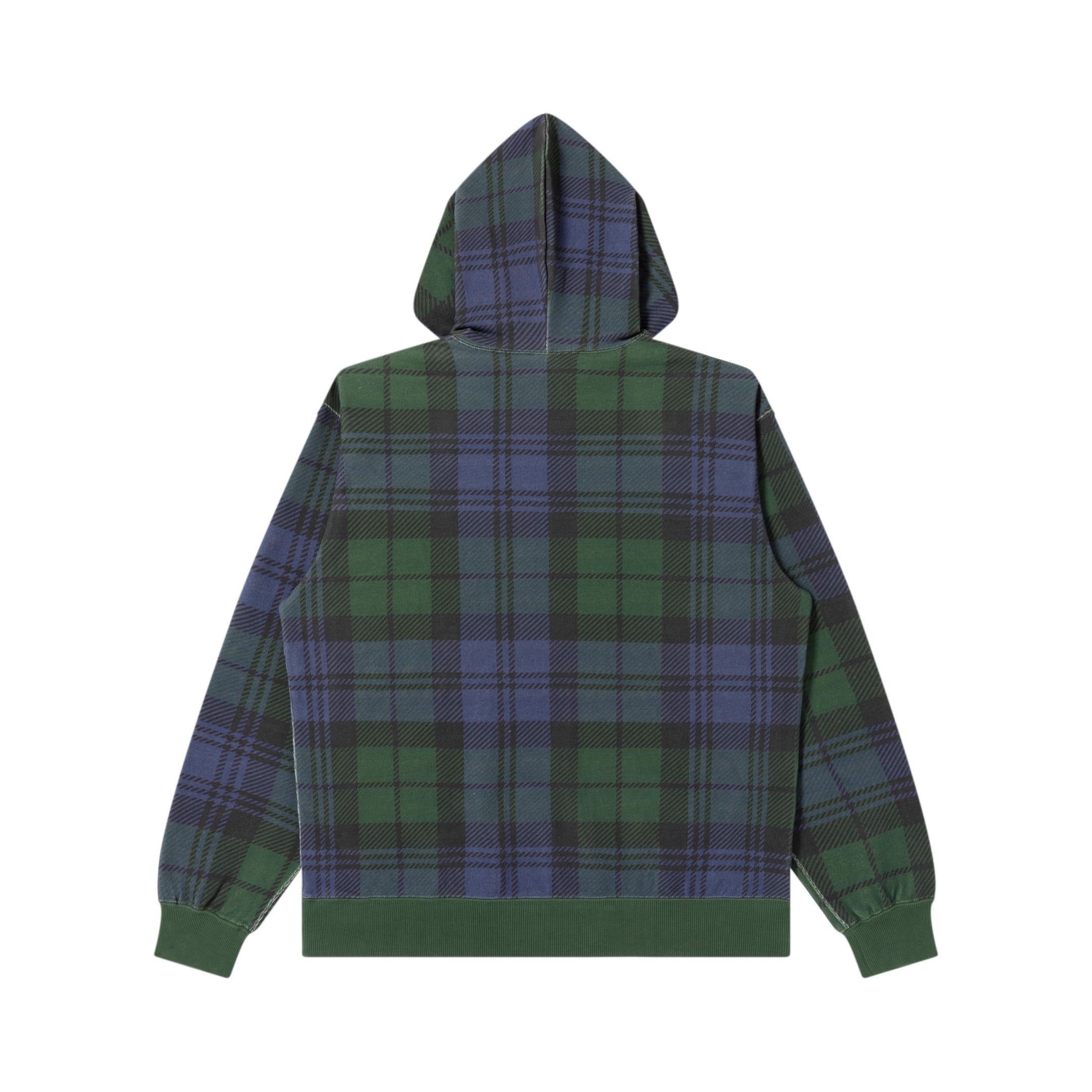 フロントにクラウンロゴのグラフィックを刺繍で施したブラックウオッチのチェック柄プリントの生地を使用したプルーオーバーフーディー。