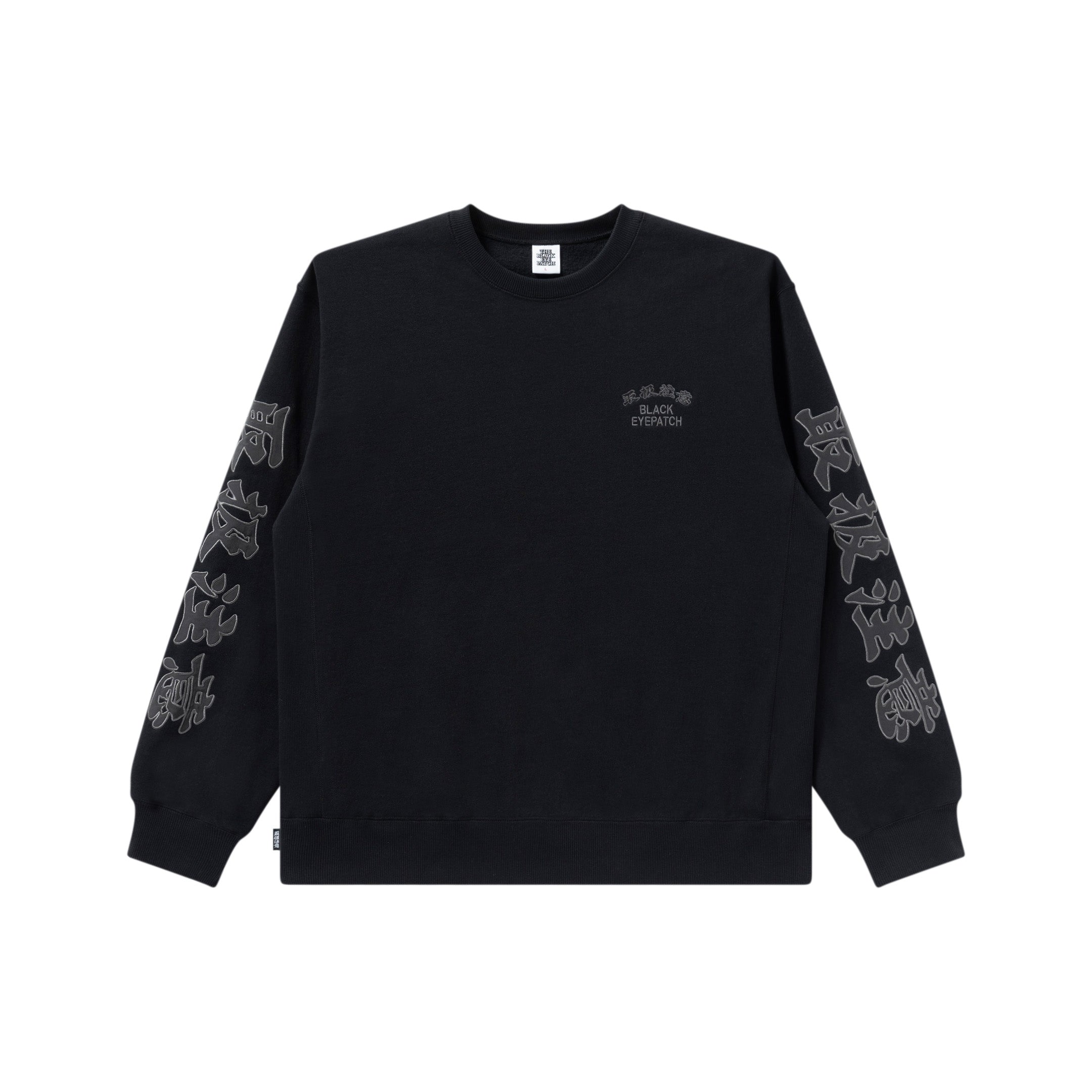 左胸に "取扱注意" のグラフィックをボディと同系色で刺繍、両袖には "取扱注意" のアップリケを縫い付けたワントーンで仕上げたクルーネックスウェット。