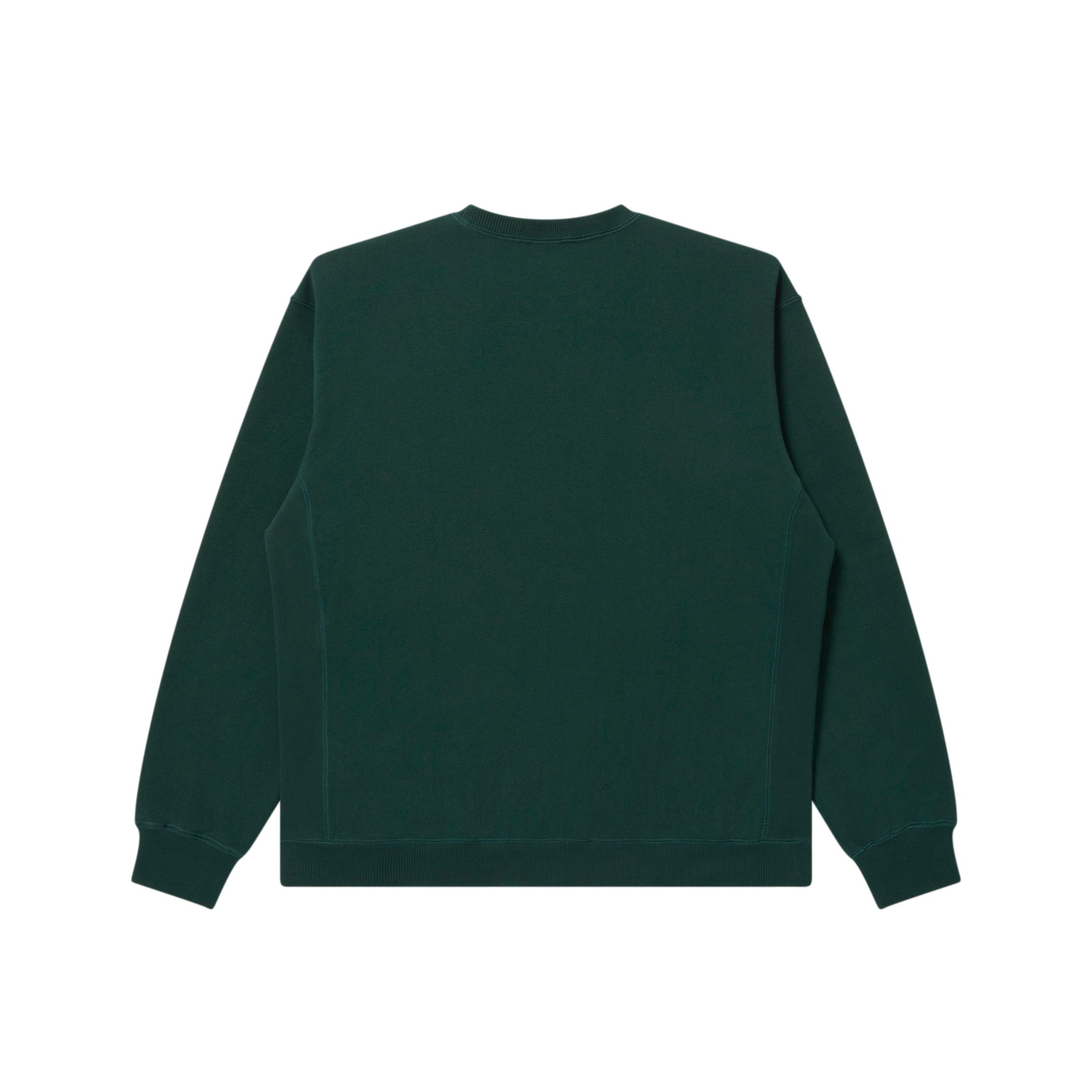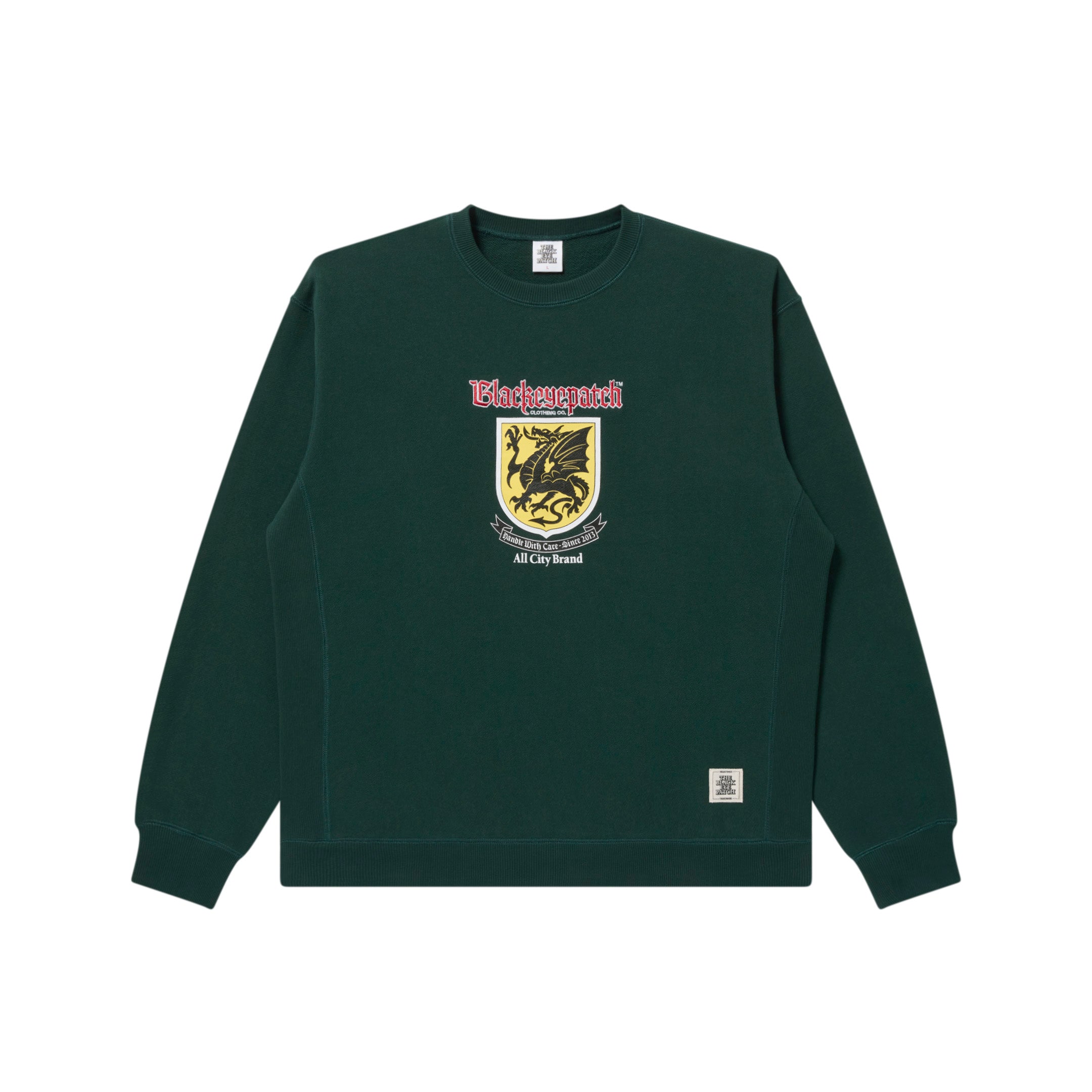 海外のアルコール飲料のラベルを彷彿させる北欧調のエンブレムグラフィックのプリントとブランドロゴを刺繍で施したクルーネックスウェット。
