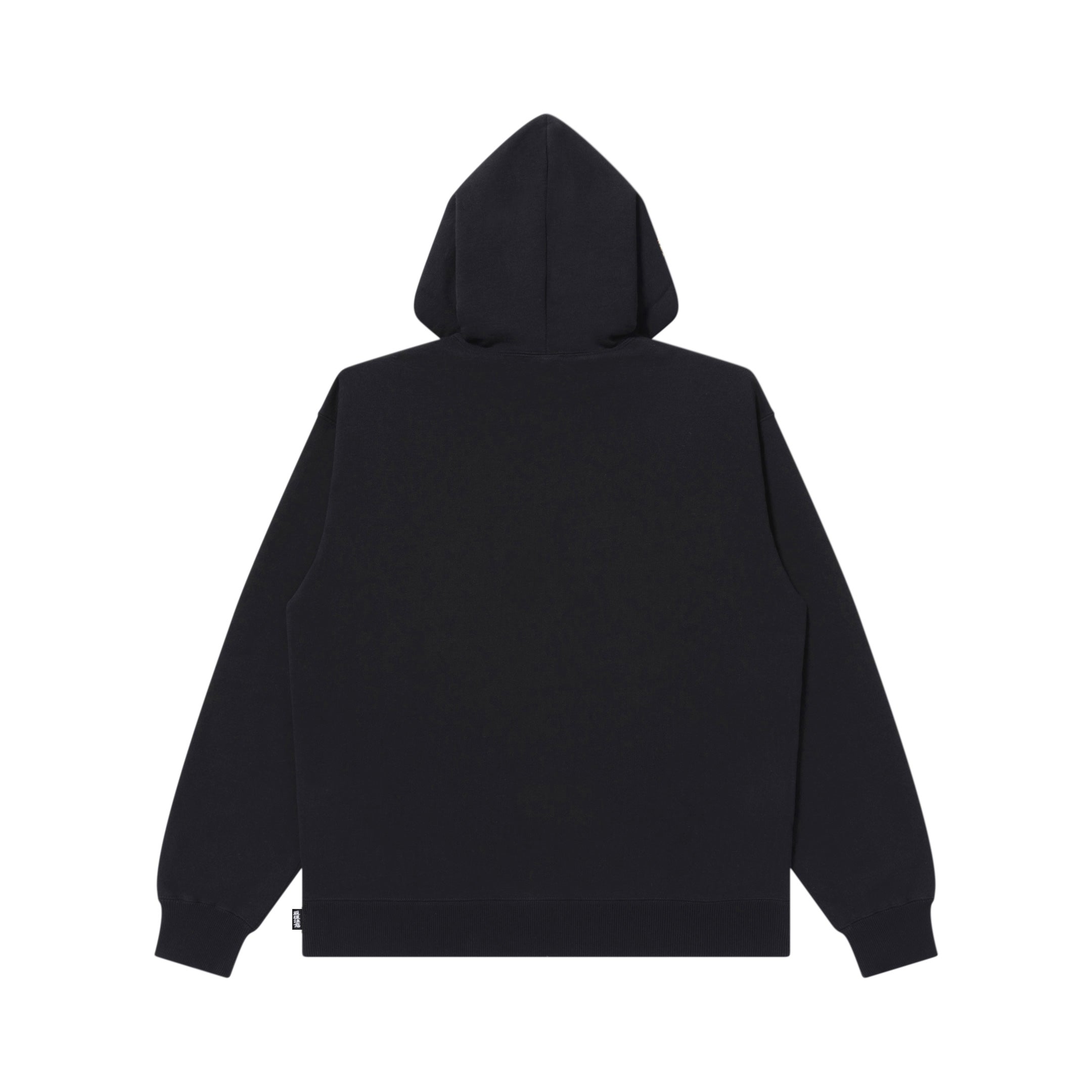 A 12.5oz zip-up hoodie featuring an appliqué brand logo in an Old English font.