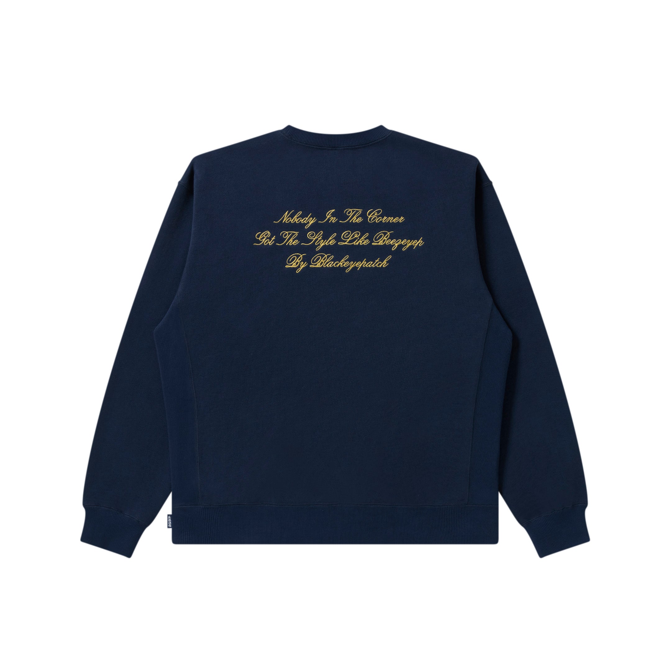 筆記体フォントのブランドロゴがフロントに、背中にメッセージが刺繍されたクルーネックスウェット。