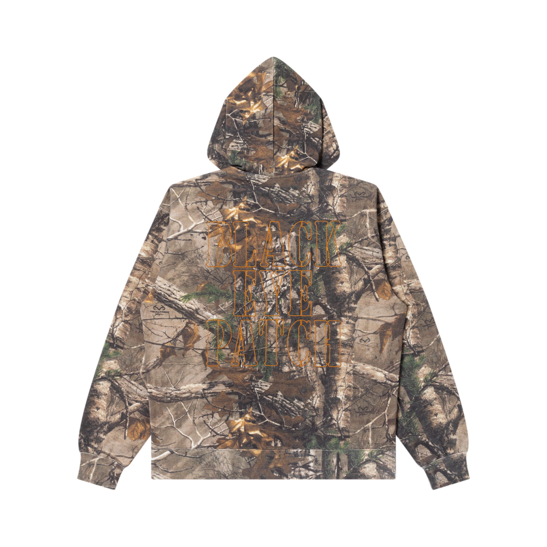 A 12.5oz all-over sweatshirt zip hoodie featuring real tree pattern print with army stencil style brand logo embroidered on the front and back.