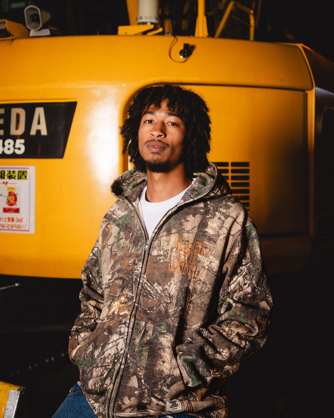 フロントとバックにアーミーステンシル調のブランドロゴが刺繍を施したリアルツリー柄をプリントした総柄スウェットジップフーディ。
