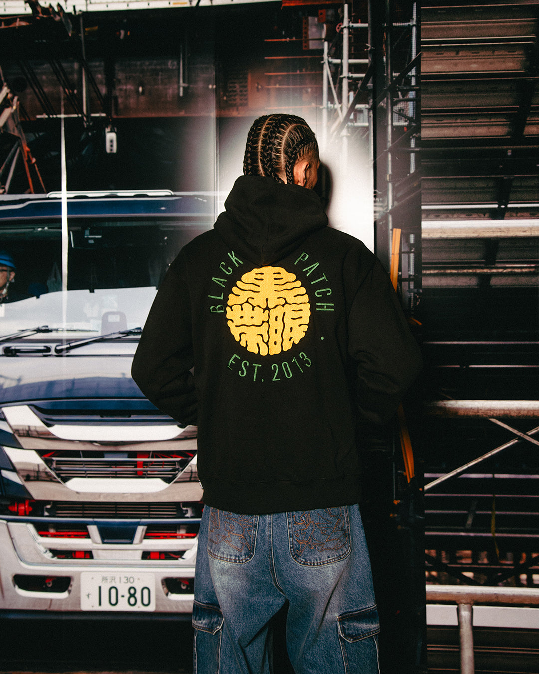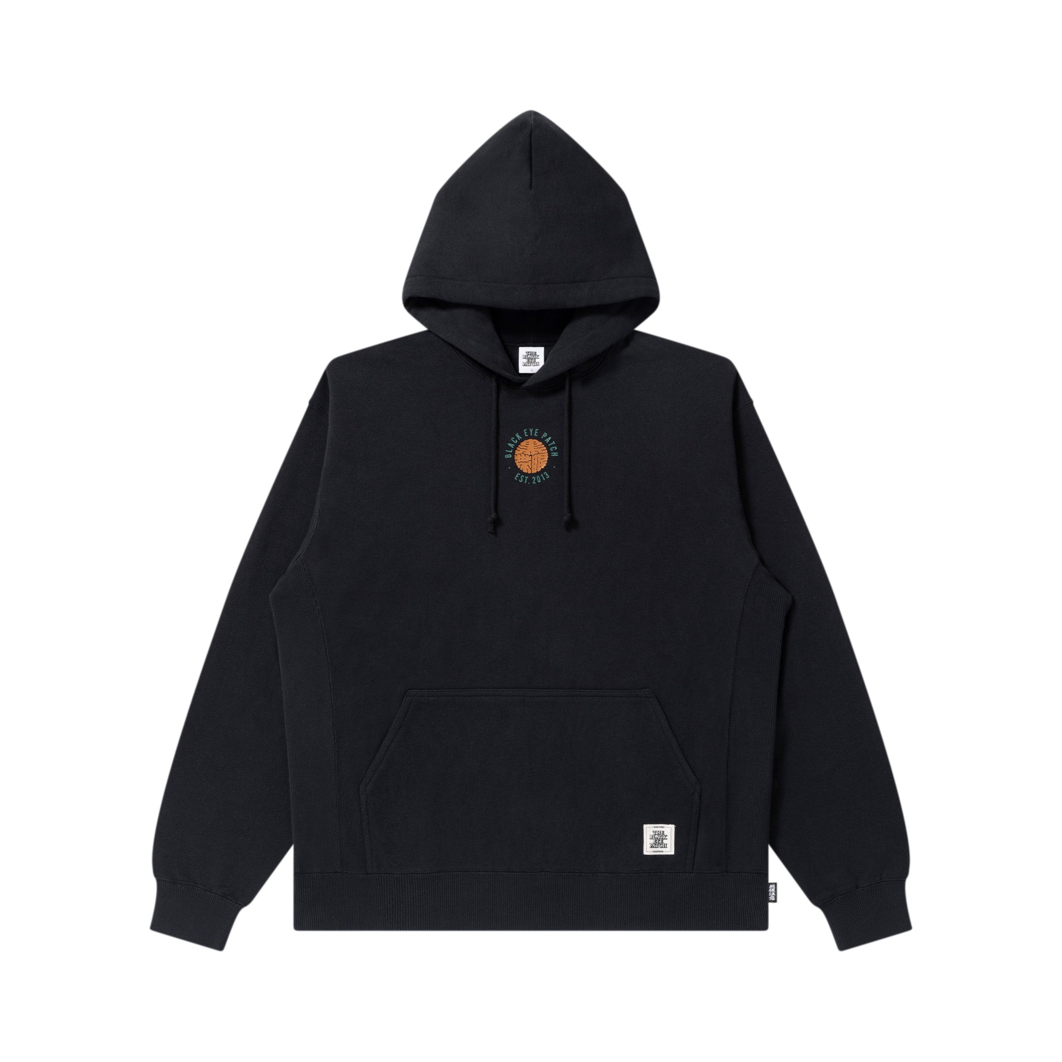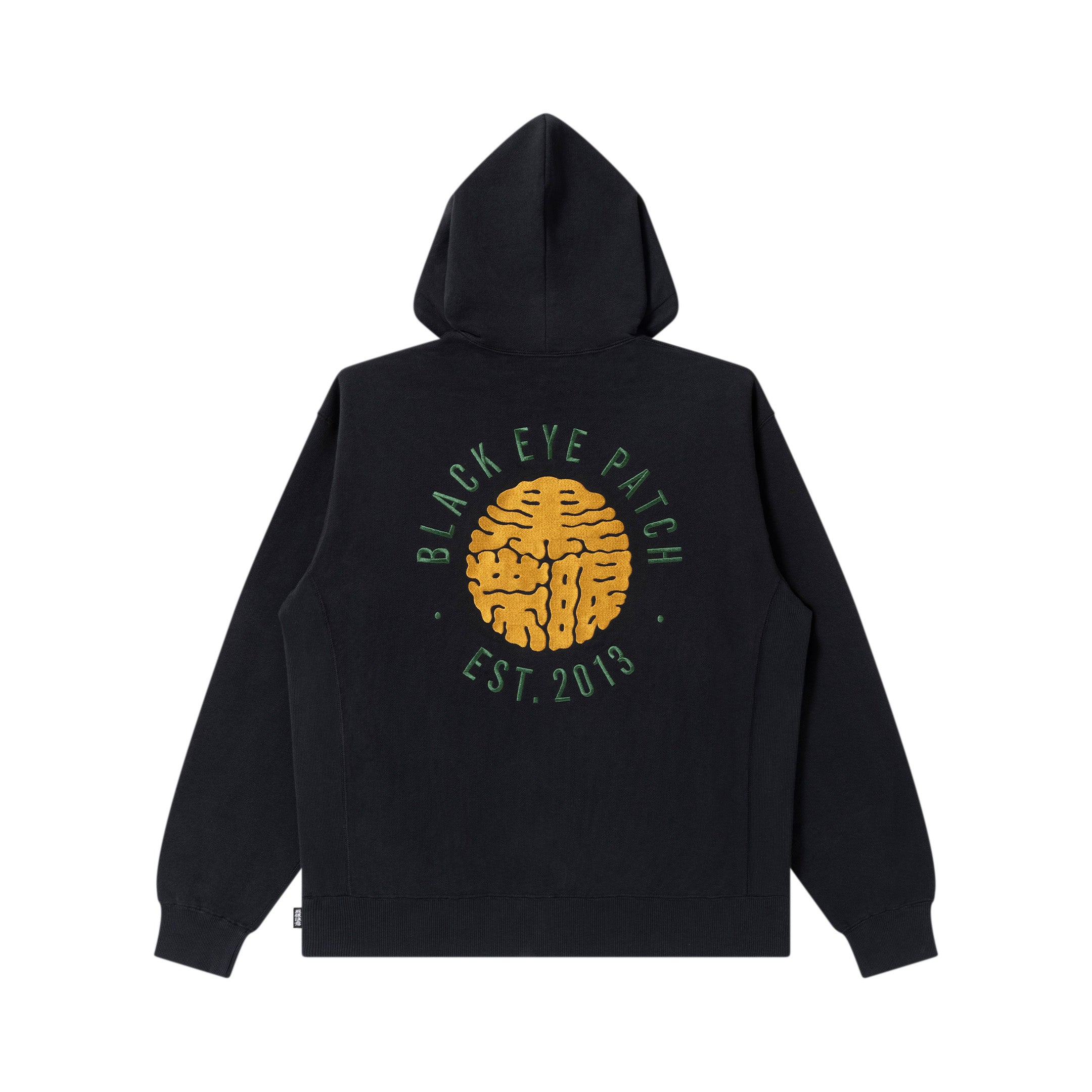 A western approach to the "KAMON" graphic of a "black eye patch" by the Japanese calligraphy style Yose character and Edo character calligrapher Tachibana Unokichi. This 12.5oz pullover hoodie is printed on the front and embroidered on the back.