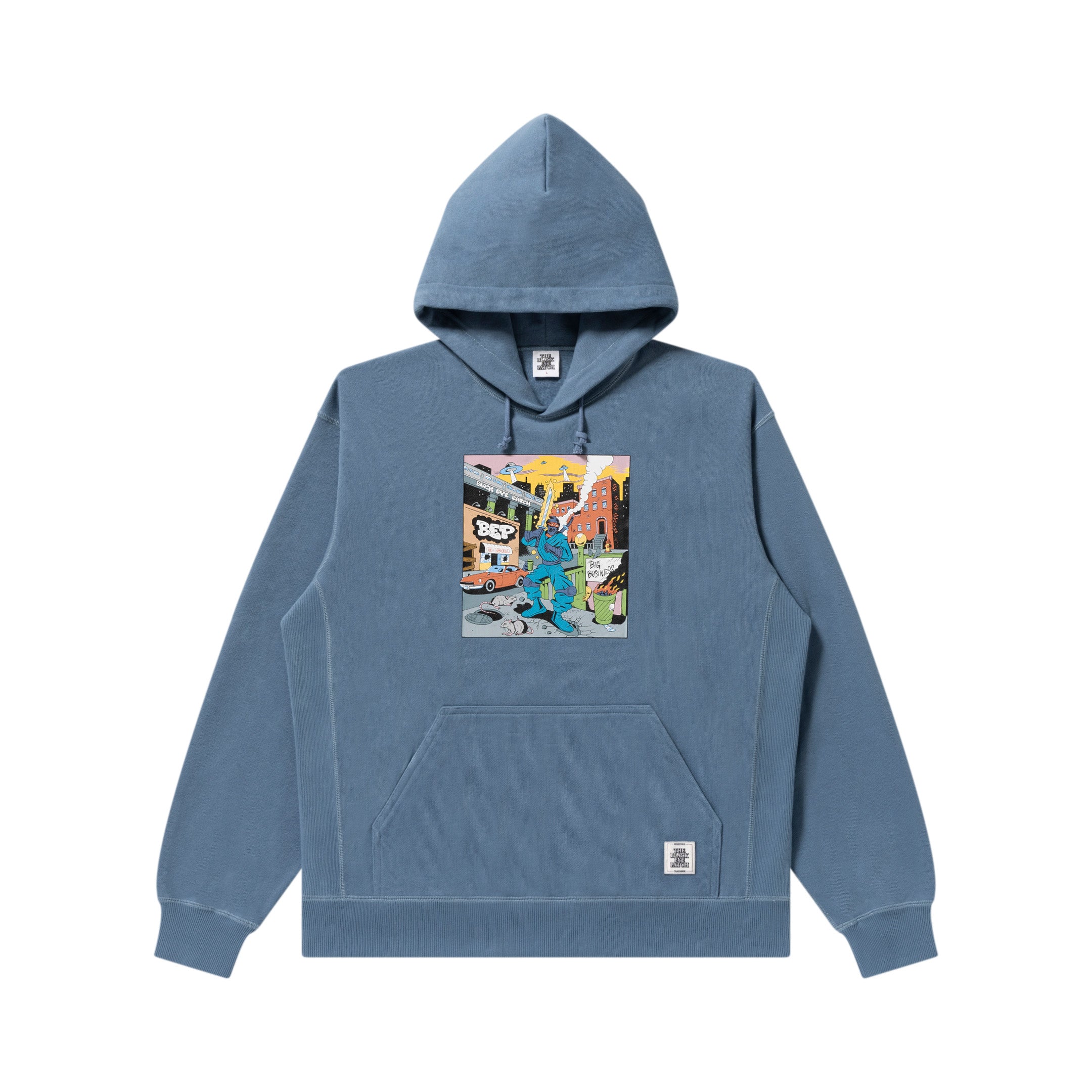 A 12.5oz pullover hoodie featuring printed artwork depicting the world of BEP in Harlem by Chris M Wilson, an American artist who designed the cover of Denzel Curry's "Unlocked" album.