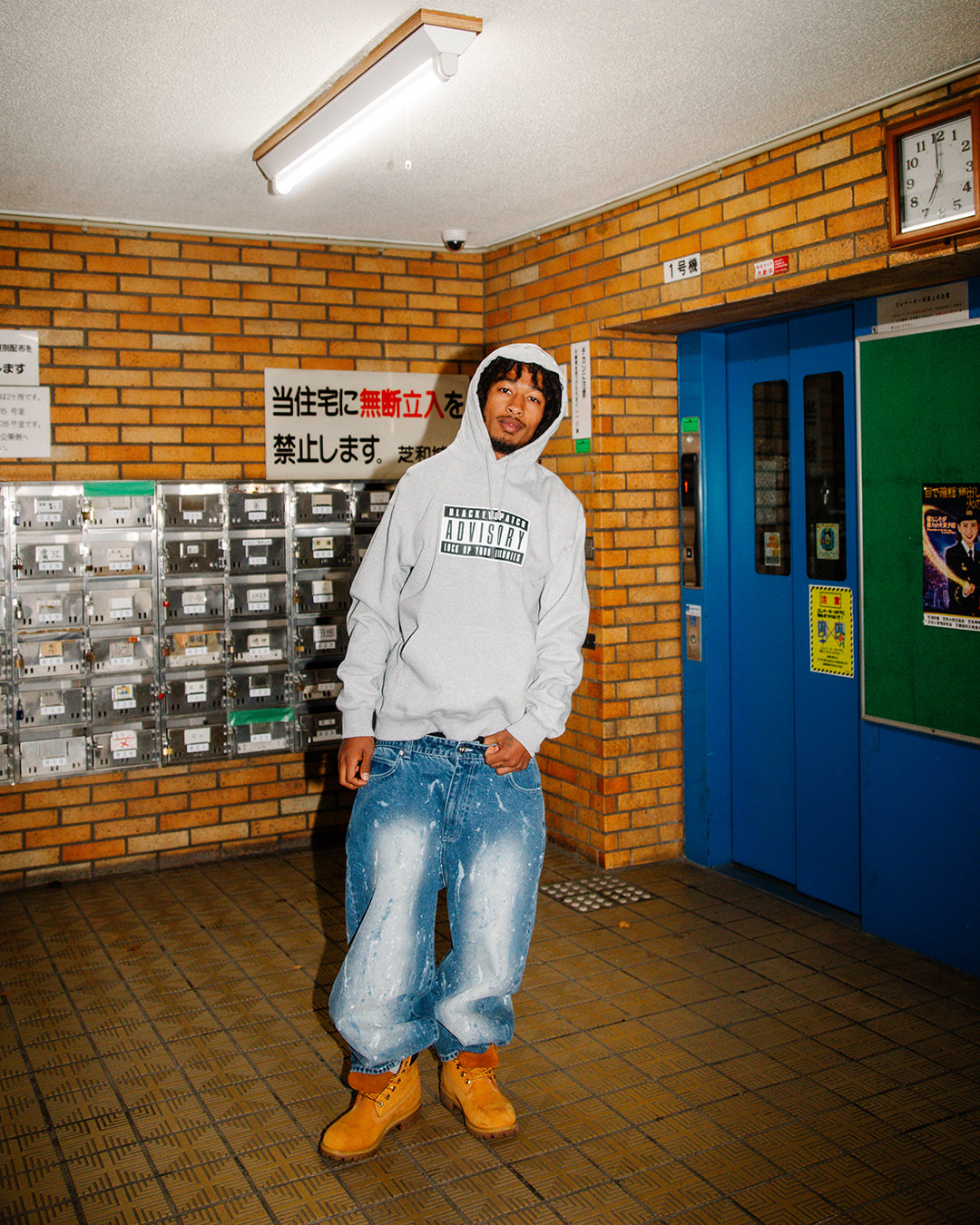 全米レコード協会(RIAA)によるペアレンタル・アドバイザリーのラベルにブランド名やメッセージをサンプリングしたグラフィックをプリントしたプルオーバーフーディ。
