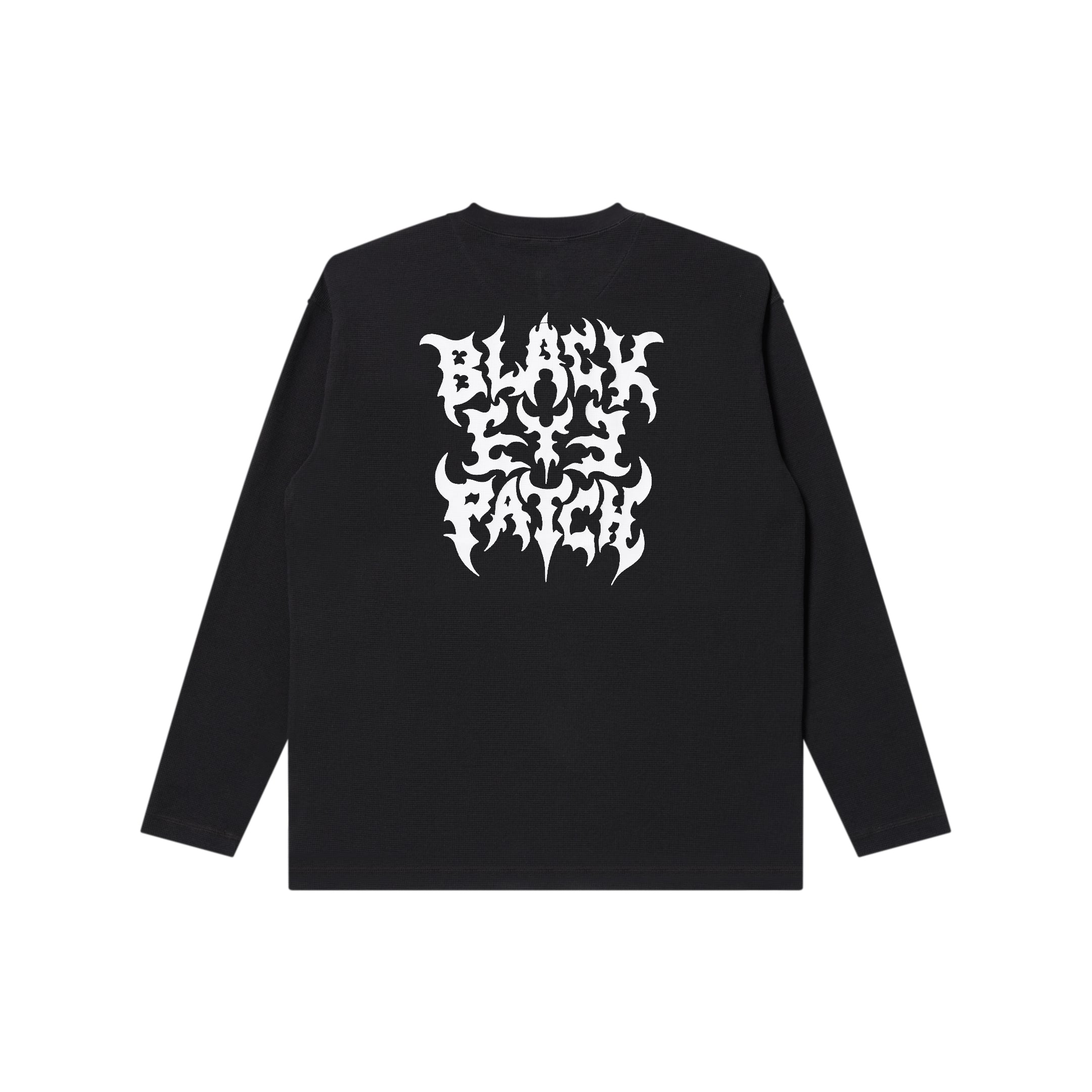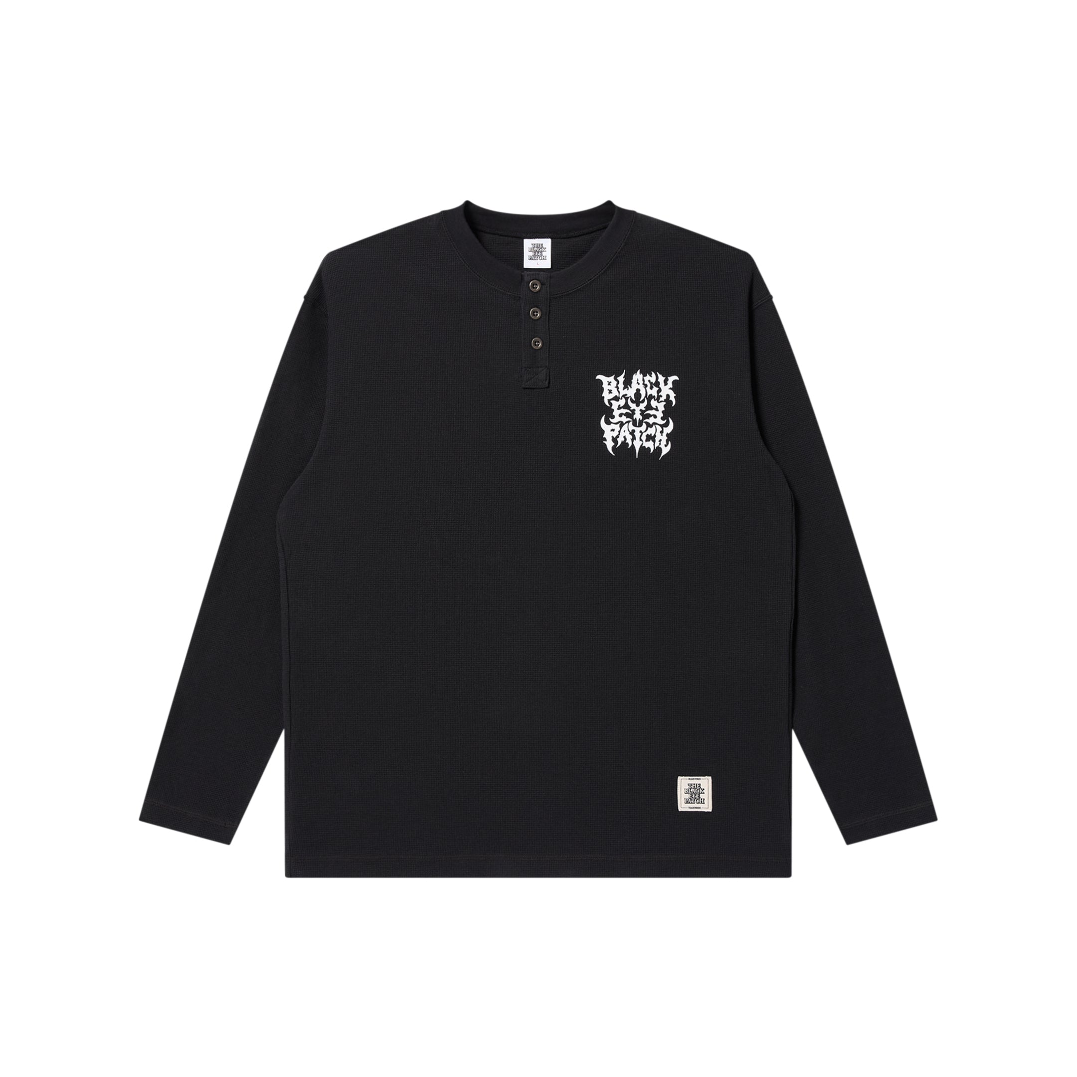 METAL BAND LOGO をプリントしたサーマル生地のヘンリーネックロングスリーブ T シャツ。