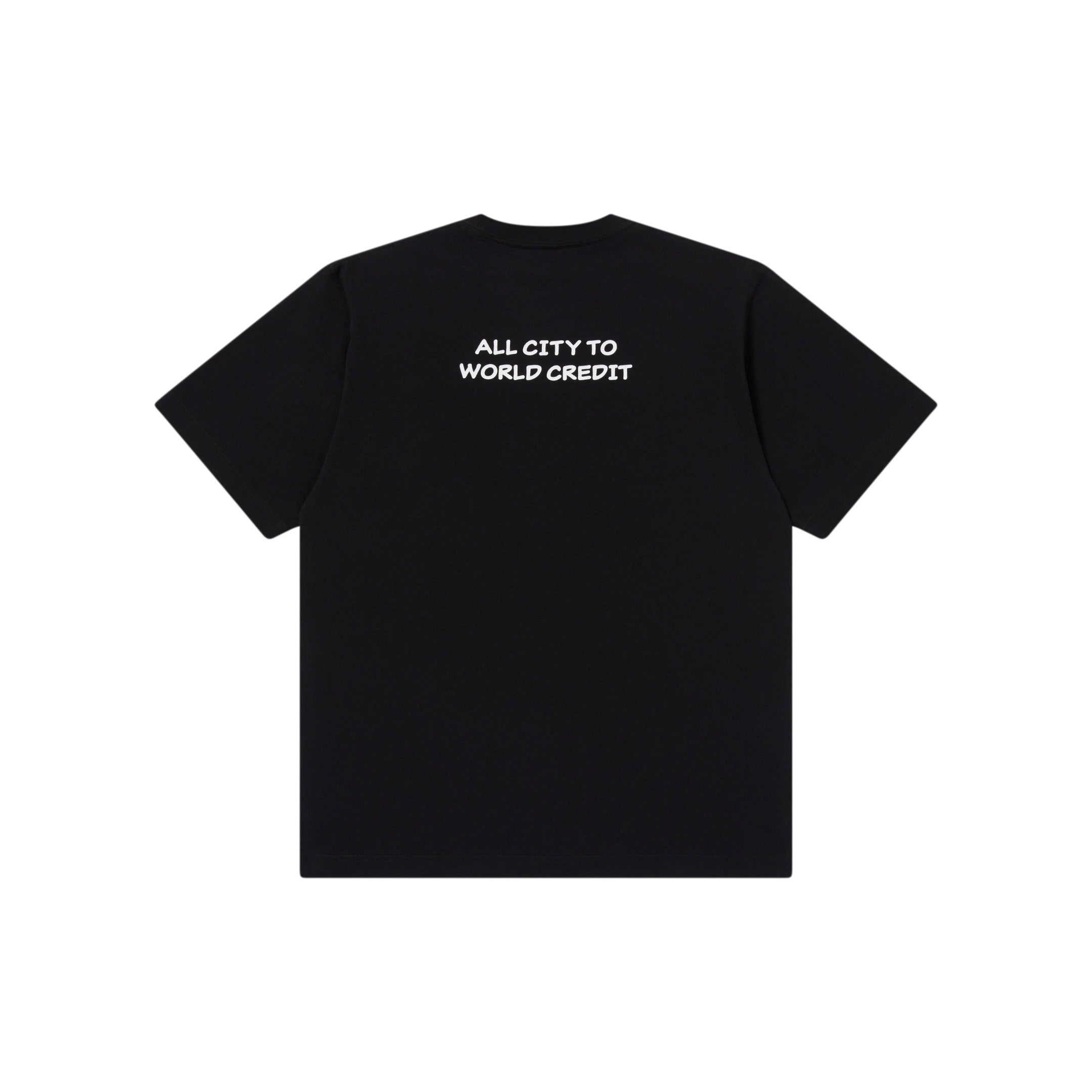 A 8.5oz t-shirt featuring the brand's original character “OG BOY” printed in dark tones on the front. The back features typography reading “ALL CITY TO WORLD CREDIT,” embodying the brand's ethos.