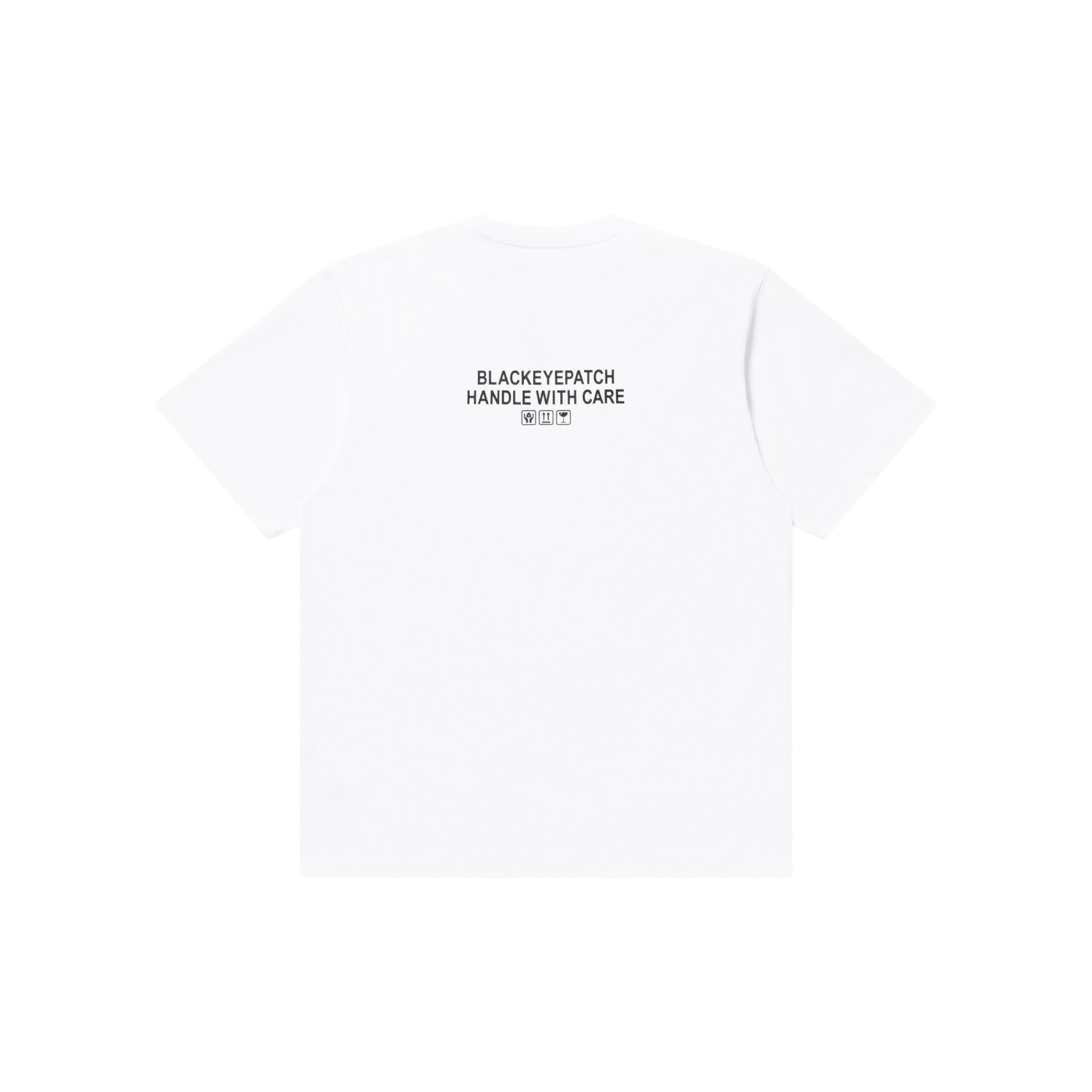 A 11oz pocket t-shirt featuring "Handle With Care" pithnames attached to the pockets. "HWC" graphic printed on the back.