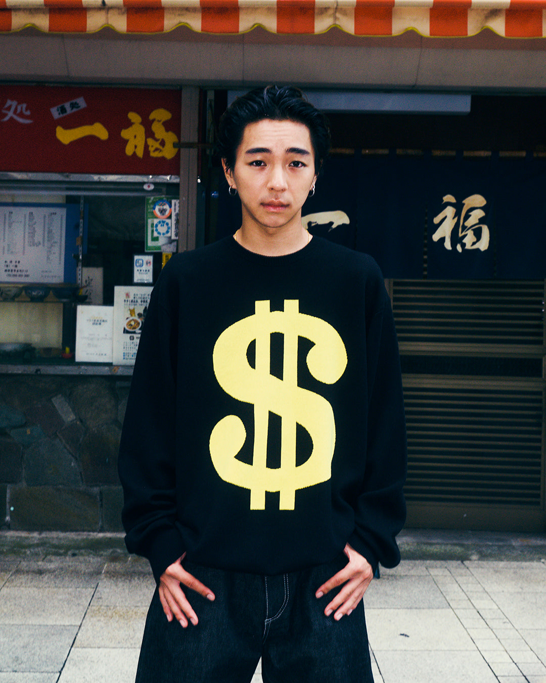 フロントにドルマークを大きく14ゲージで織り込んだニット。