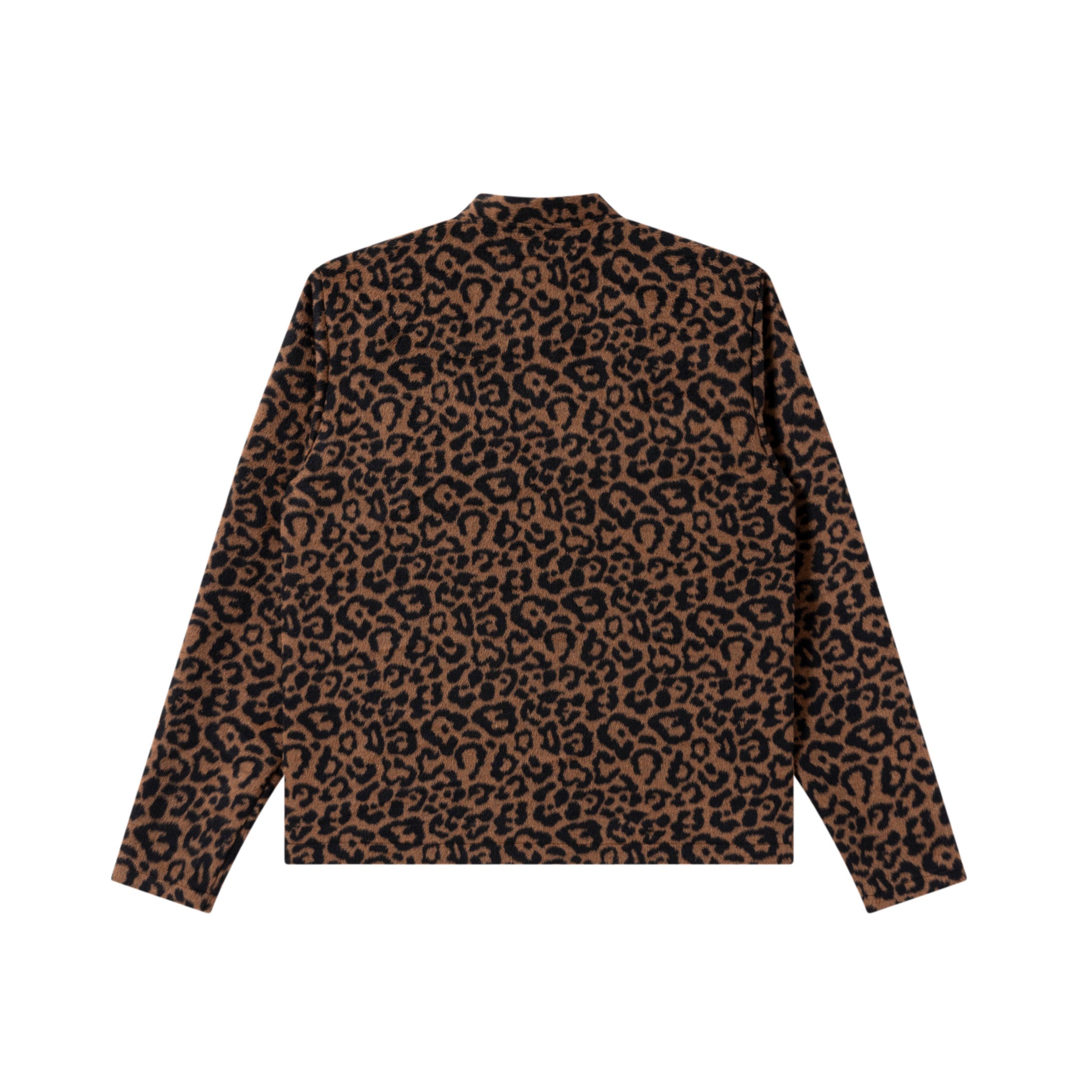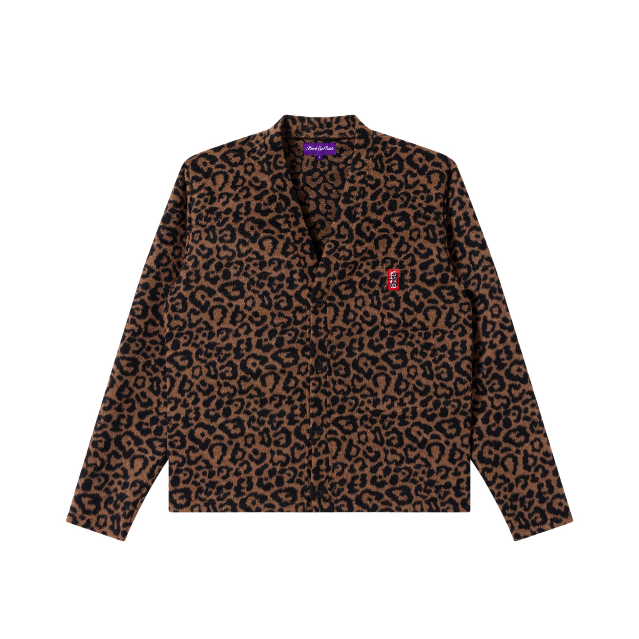 Leopard print cardigan featuring "Handle With Care" graphic patch on left chest. It is characterized by its long fur and moderate firmness to the touch.