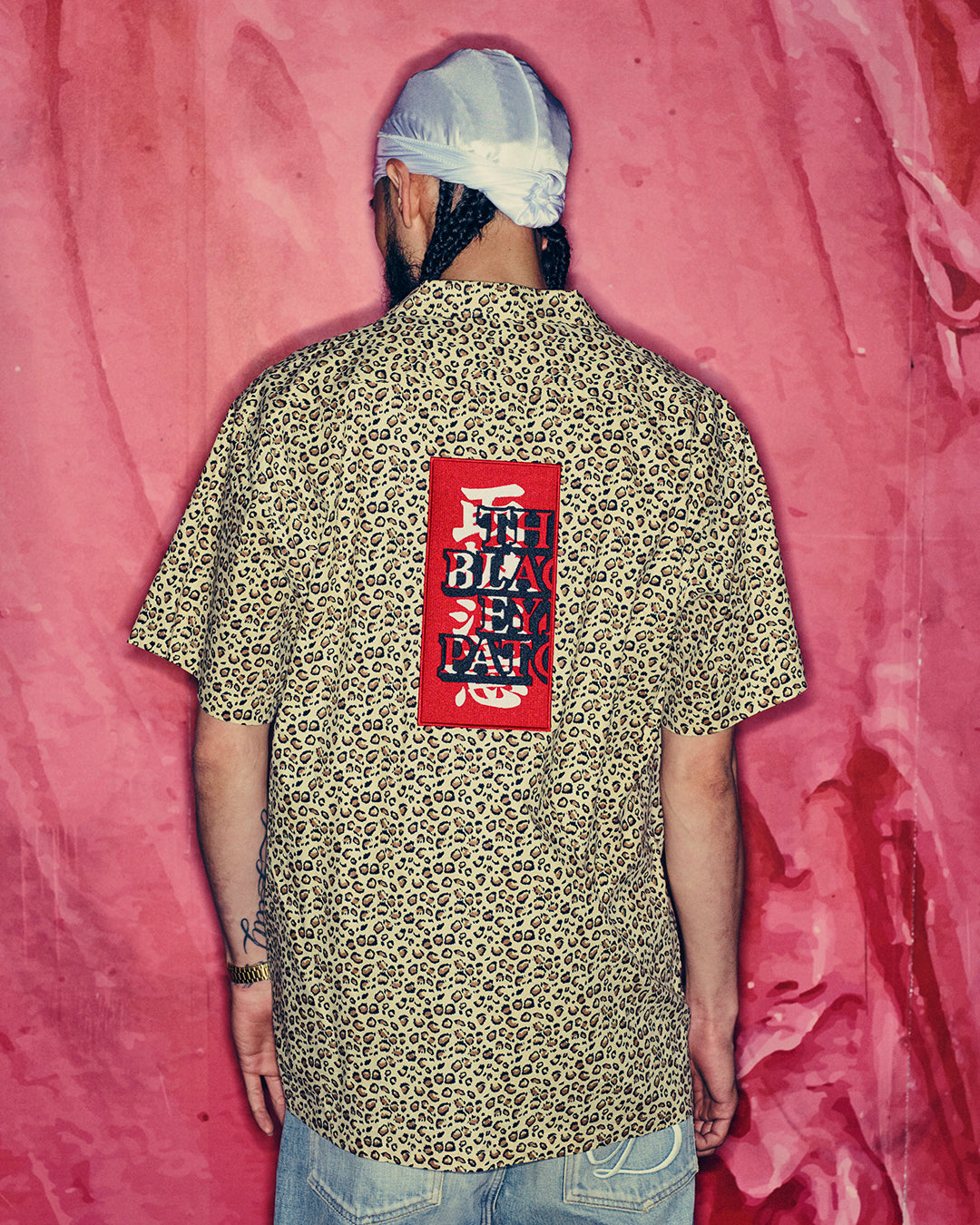 左胸に "取扱注意" とブランドロゴの刺繍、背面に "取扱注意" のラベルロゴ刺繍をボディと同系色で配したレオパード柄の開襟シャツ。