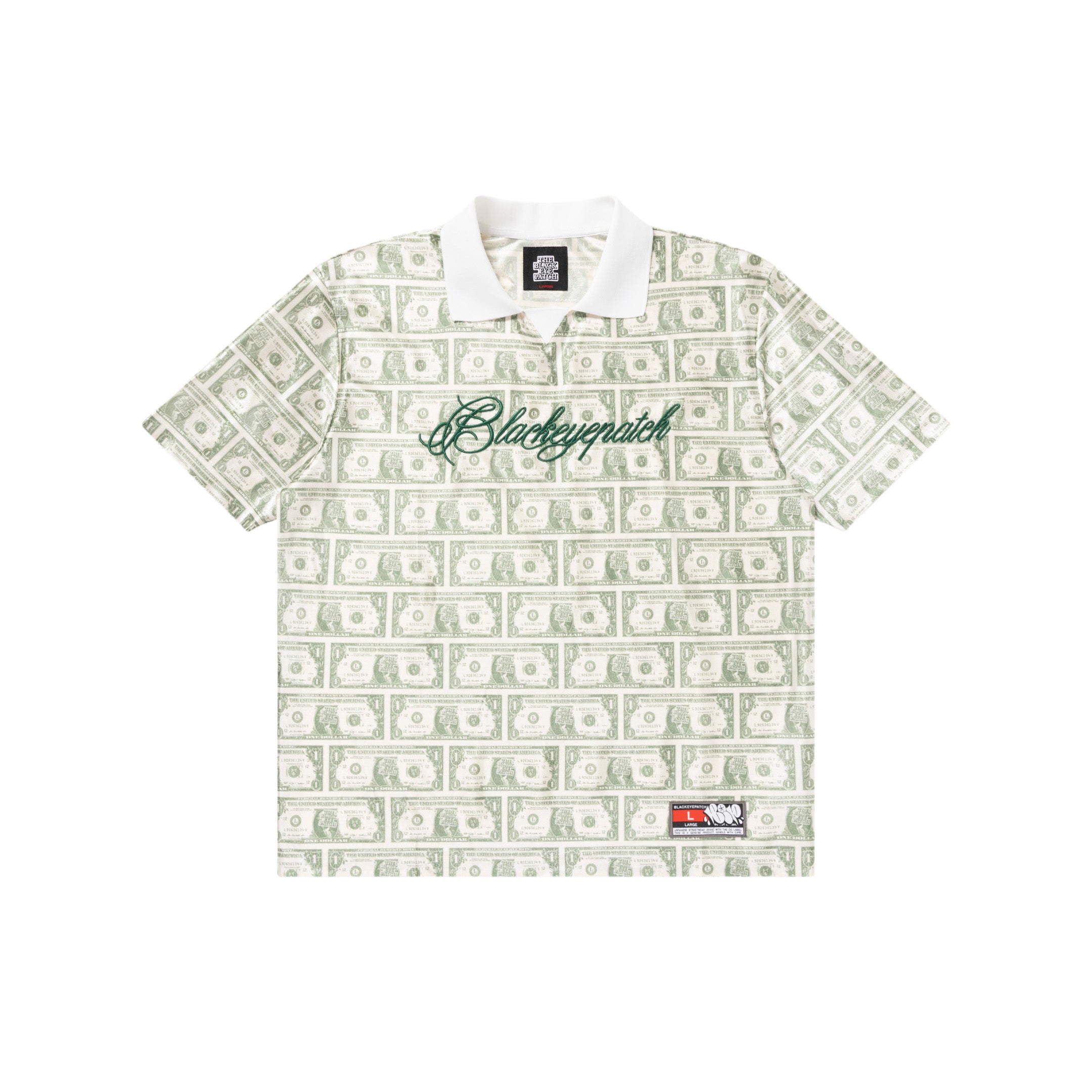 Game shirt featuring an all-over graphic print of the "OG LABEL" woven into the $1 bill. Brand logo on the chest is embroidered with urethane. Original sporty name tag at hem.