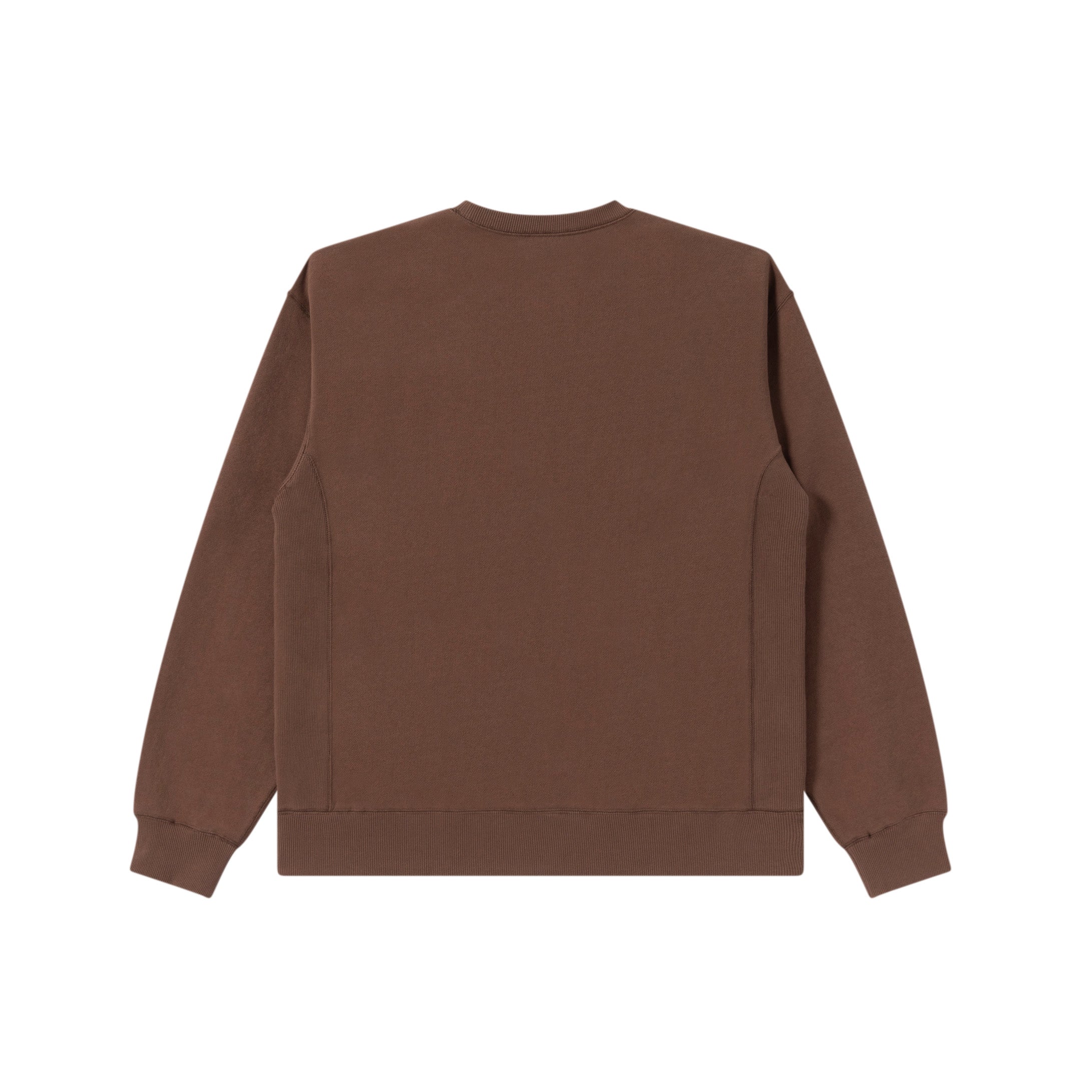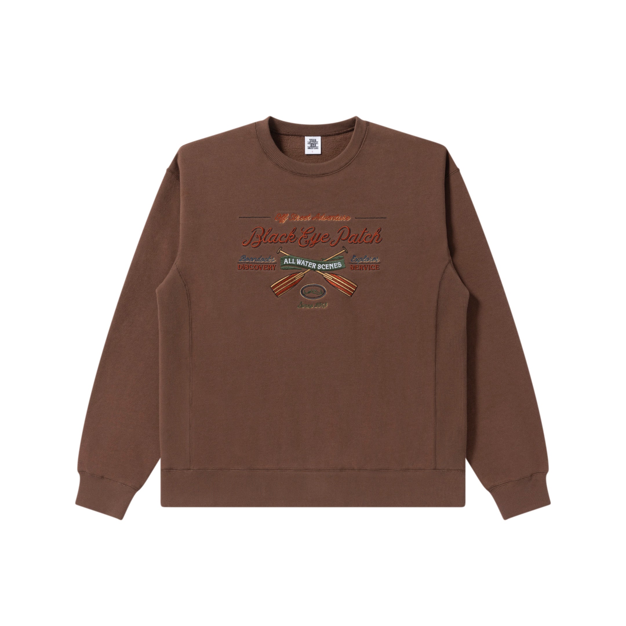 A 12.5oz Crew neck sweatshirt featuring retro graphics reminiscent of a certain outdoor brand embroidered on the front.