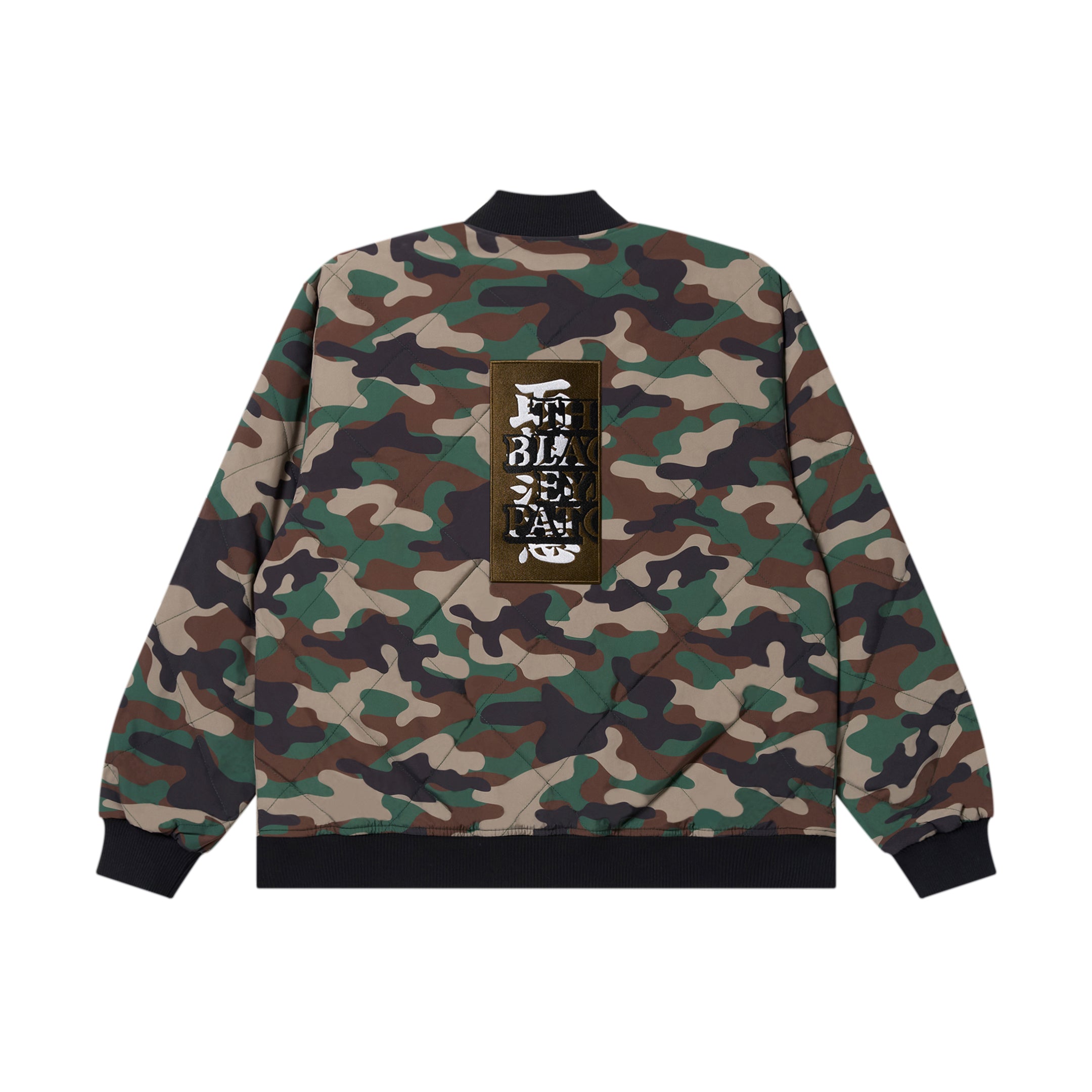 Quilted jacket featuring “Handle with Care” embroidered on the back. Available in two colors: black and woodland camo.