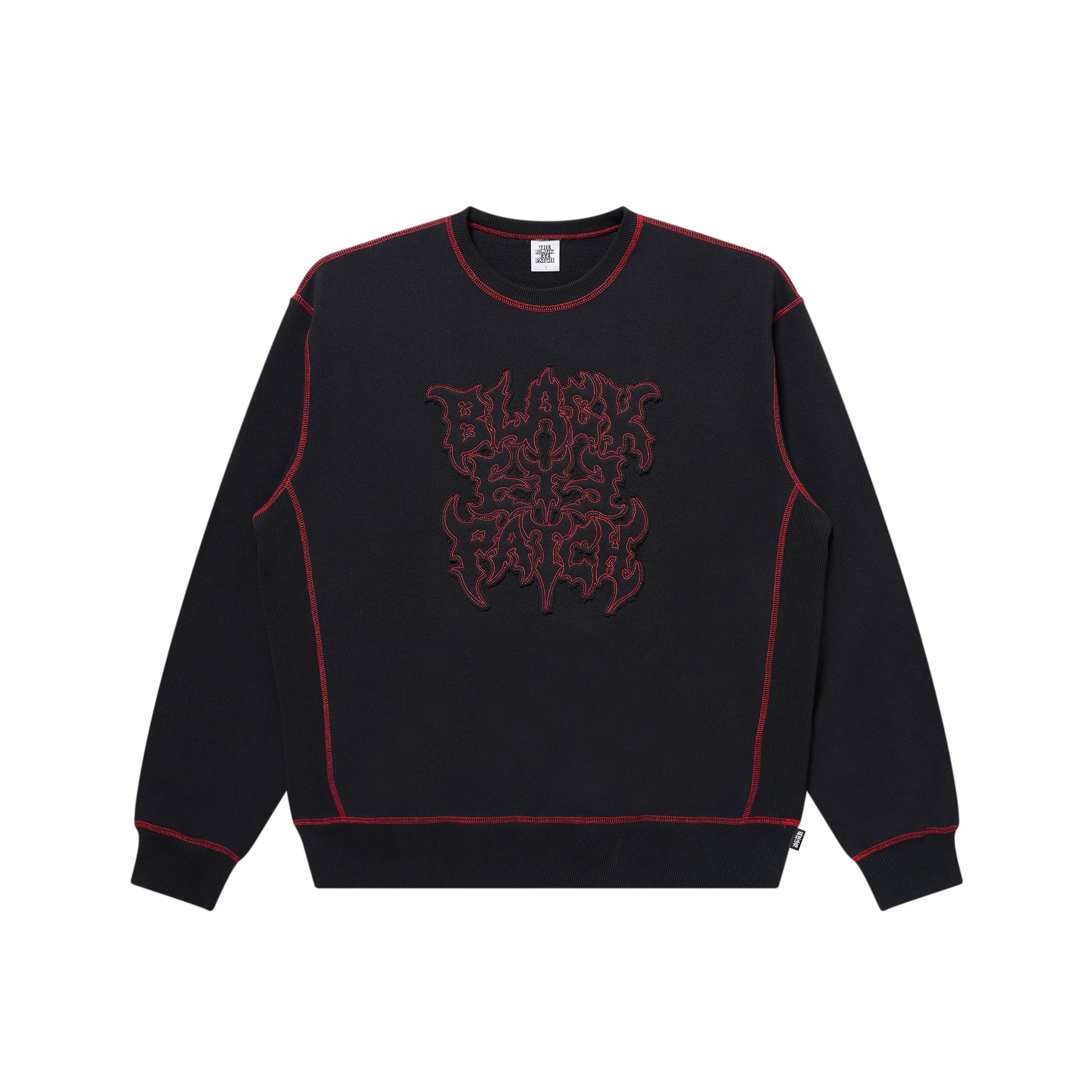 A 12.5oz crewneck sweatshirt featuring a death metal-inspired logo embroidered with a patch using the same fabric as the body. The stitching color is contrasted with the body fabric for an accent finish.